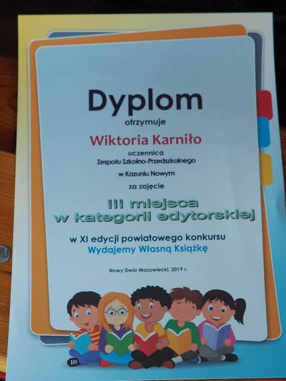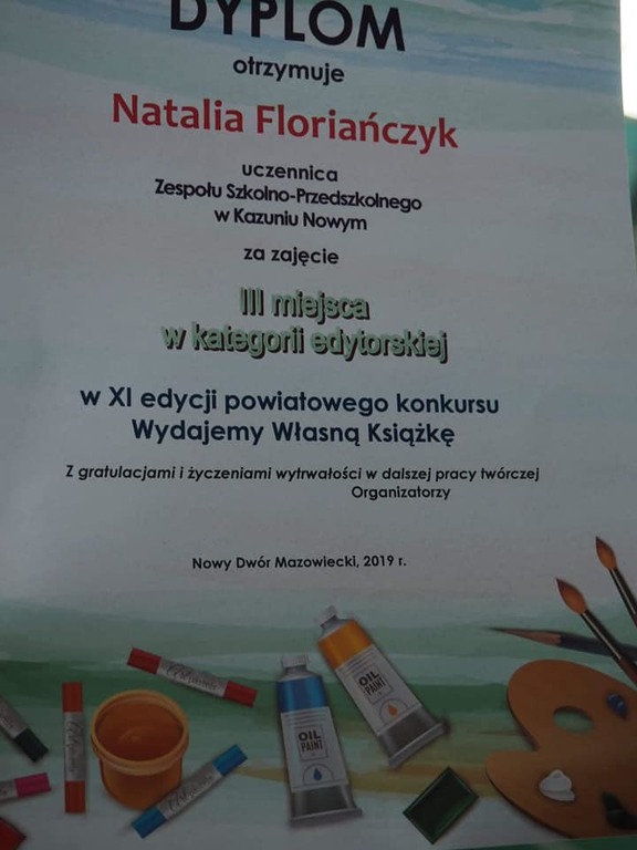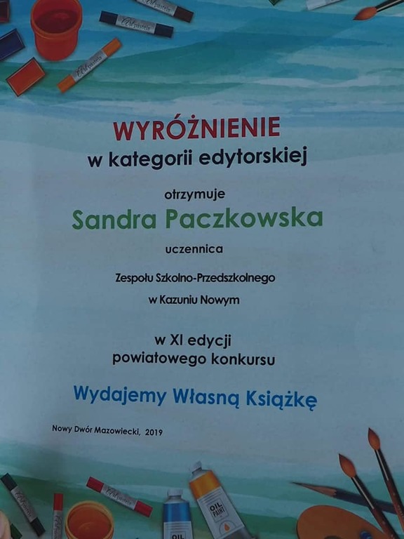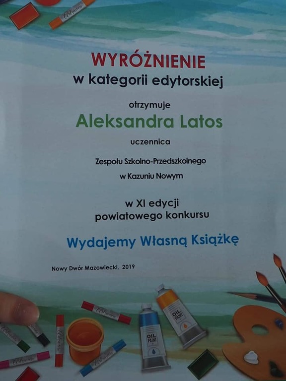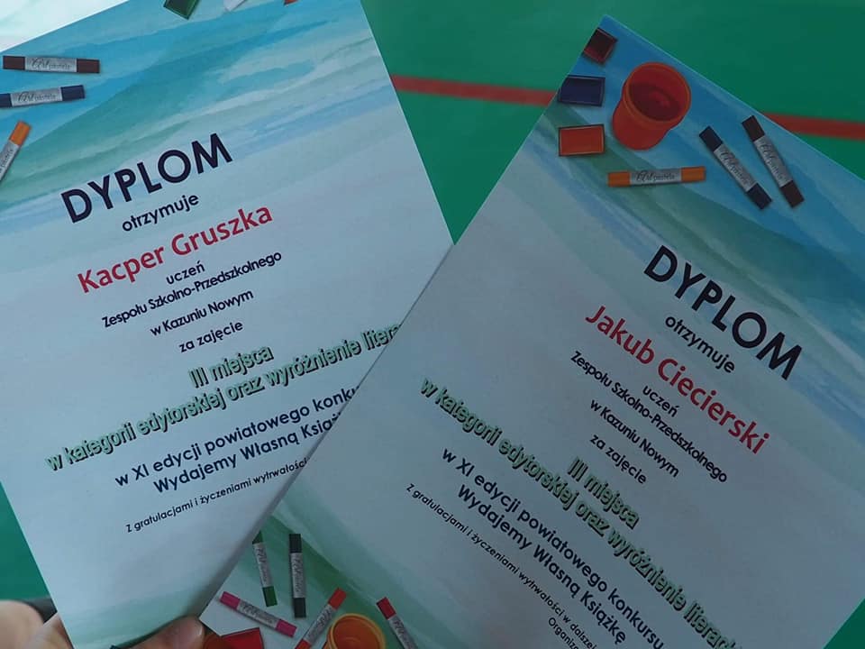 II miejsce w kategorii edytorskiej i wyróżnienie literackie, Natalia Floriańczyk kl. 7 III miejsce w kategorii edytorskiej, Wiktoria Karniło kl. 3 III miejsce w kategorii edytorskiej, Kuba Ciecierski oraz Kacper Gruszka kl. 6 III miejsce w kategorii edytorskiej i wyróżnienie literackie, Aleksandra Latos kl. 7 i Sandra Paczkowska kl.8 - wyróżnienia w kategorii edytorskiej. Uczniowie już zapowiedzieli, że szykują się do pisania kolejnych książek, a zatem serdecznie gratulujemy zapału, sukcesów i czekamy na nową, pasjonującą twórczość.