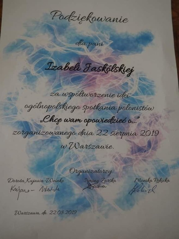 Dnia 22.08.2019r. w Wawerskim Centrum Kultury w Warszawie odbyła się konferencja dla nauczycieli polonistów, podczas której jedną z prelegentek była pani Izabela Jaskólska. „Chcę Wam opowiedzieć o...” było spotkaniem nauczycieli praktyków, którzy dzielili się swoim doświadczeniem, pomysłami i inspirowali ponad dwustu uczestników z całej Polski przybyłych na konferencję. Prelegenci przygotowali różnorodne tematy dotyczące zarówno pracy z młodszymi dziećmi, jak i z młodzieżą szkół ponadgimnazjalnych. Pani Izabela prezentowała temat „Jak stworzyć własną książkę? Sposób na aktywizację i rozbudzenie kreatywności uczniów”,a dopełnieniem wystąpienia była wystawa książek, (prac konkursowych uczniów z powiatu nowodworskiego), udostępnionych dzięki uprzejmości pani Agnieszki Sokołowskiej - kierownik biblioteki pedagogicznej w Nowym Dworze Mazowieckim. Takie inicjatywy pokazują potrzebę wymiany doświadczeń oraz dbania o własny rozwój, a tym samym podnoszenia jakości pracy szkoły.