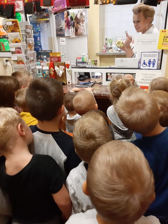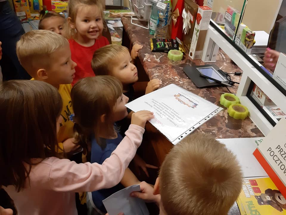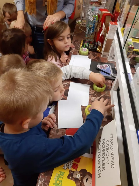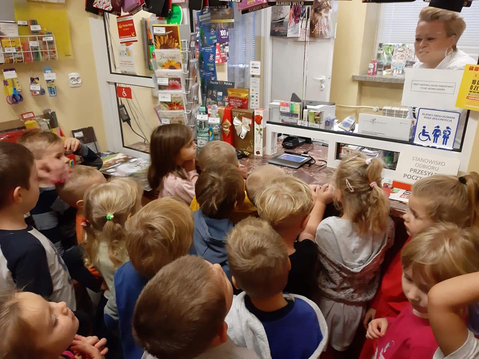 Następnie wybraliśmy się na wycieczkę do Urzędu Pocztowego w Kazuniu Nowym. Przedszkolaki z wielkim zainteresowaniem oglądały pomieszczenie poczty. Uświadomiły sobie, jakie duże znaczenie ma ten urząd w życiu codziennym.