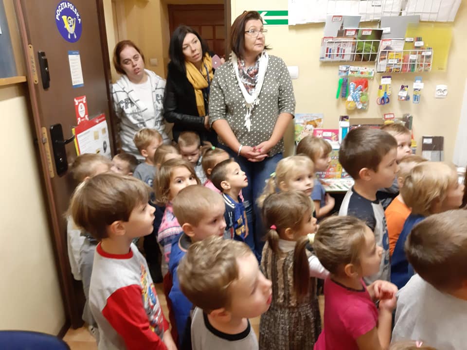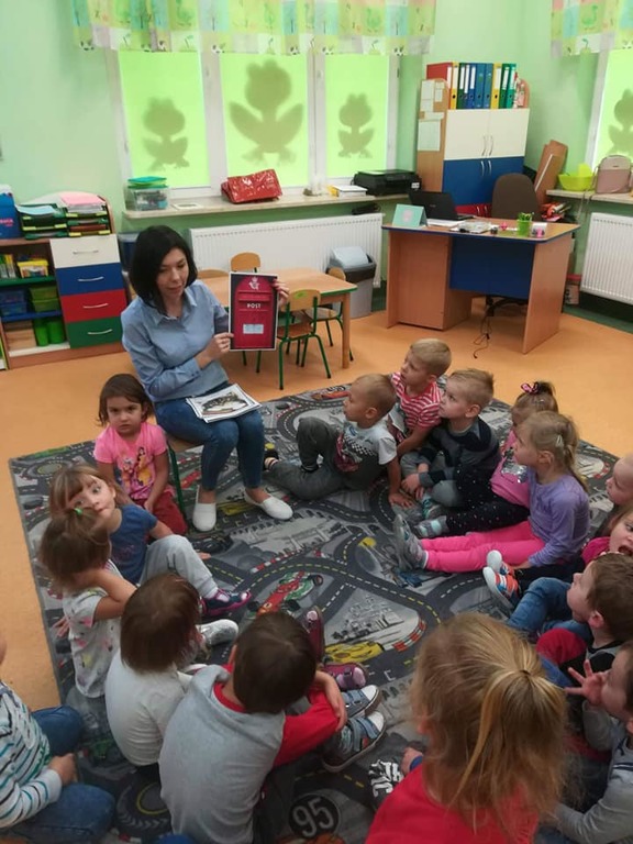 Przywitała nas pani Agnieszka Żmijewska, która zapoznała dzieci z pracą listonosza oraz innych pracowników poczty. Zapoznaliśmy się również z wyglądem symbolu poczty oraz skrzynki pocztowej. Dzieci przypomniały sobie jak przebiega droga listu od nadawcy do adresata. Była to bardzo dobra okazja, aby przypomnieć sobie jak należy zachować się miejscu publicznym.