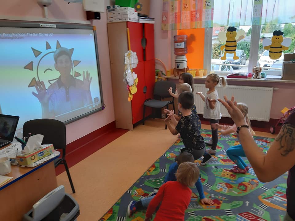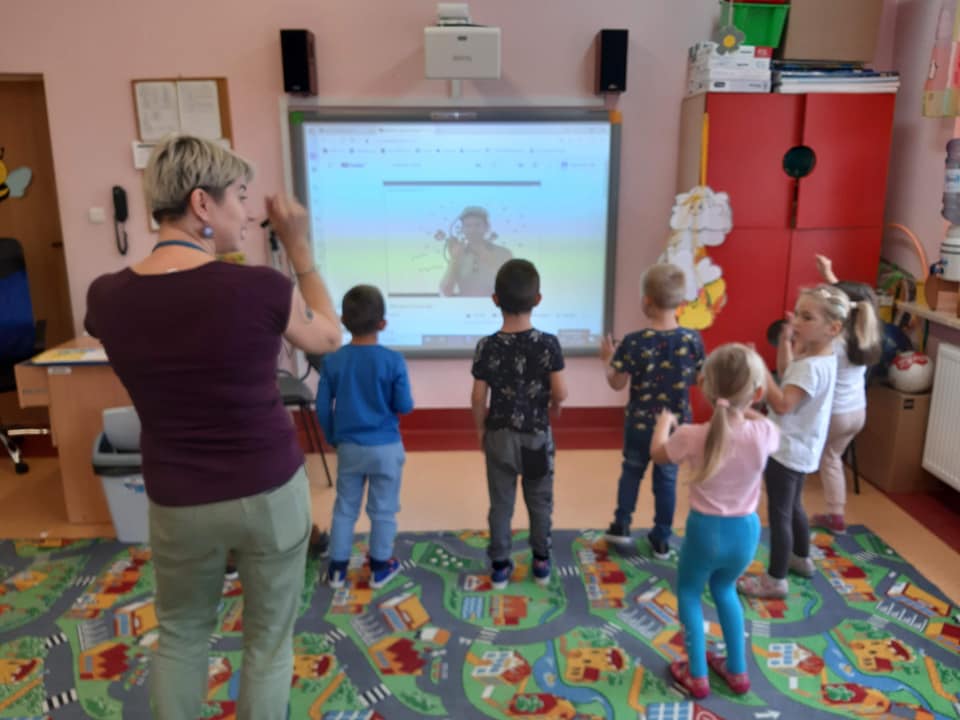 W przedszkolu odbywają się lekcje języka angielskiego z wykorzystaniem tablicy multimedialnej.