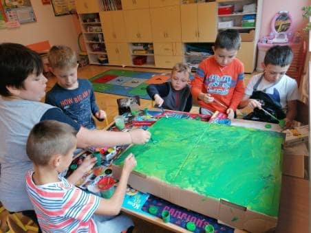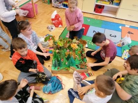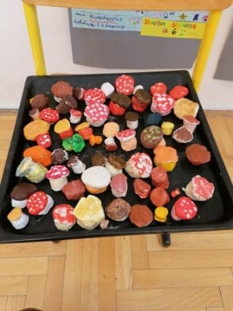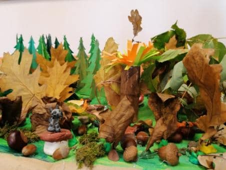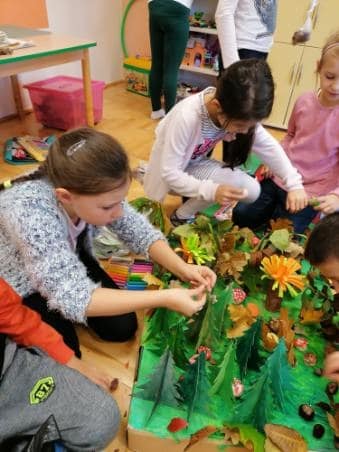 Za oknem mamy piękną złotą polską jesień, ze słoneczną pogodą i paletą przepięknych kolorów. Aż chciałoby się wybiec ze szkolnych ławek i korzystać z tej wyjątkowej jesiennej aury. Ale uczniowie klasy drugiej postanowili zatrzymać ten jesienny czas i zachować na dłużej atuty jesiennych uroków. Dlatego stworzyli makietę jesiennego lasu. Najpierw powstały rozmaite grzyby z masy solnej, które po wypieczeniu nabrały kolorów i charakteru. Kolejnym etapem było stworzenie niemal prawdziwego lasu z żywych darów jesieni tj. gałązek, kolorowych liści, kasztanów, żołędzi. Kiedy to wszystko stało się już niemal prawdziwym lasem, brakowało nam tylko leśnych zwierząt, które powstały z plasteliny. No i teraz nasz jesienny las wyglądał już bardzo autentycznie. Uczniowie napracowali się przy tworzeniu makiety, ale efekt , musicie przyznać, jest ……imponujący.