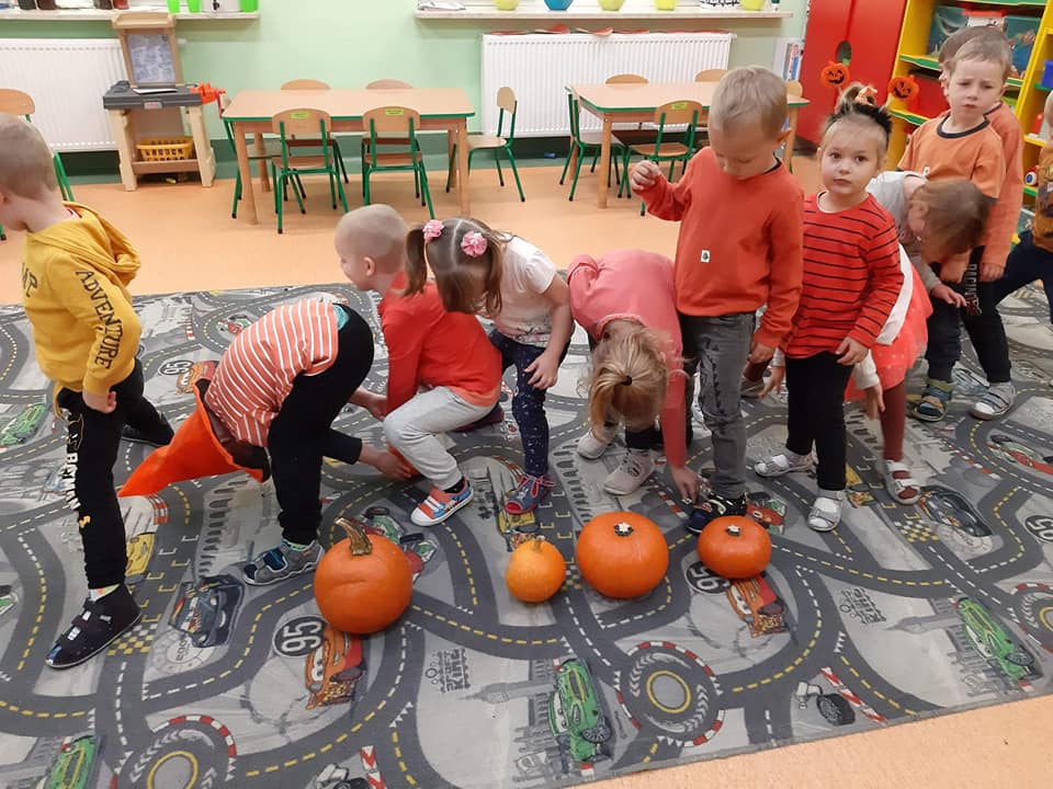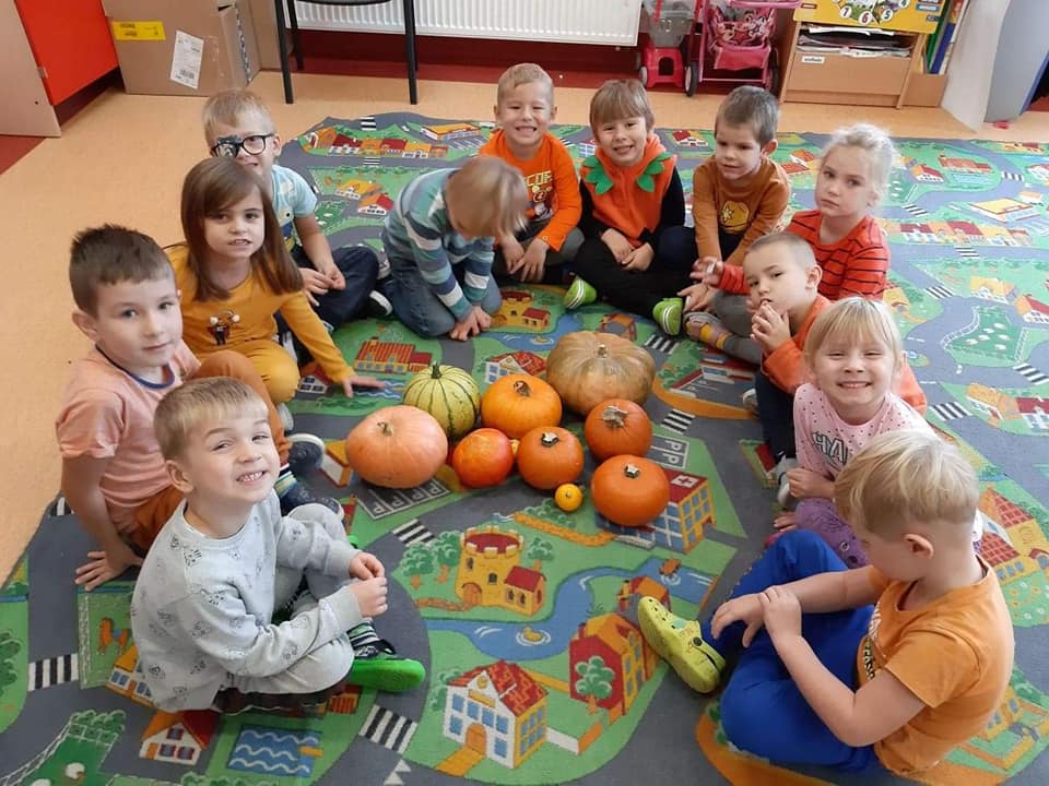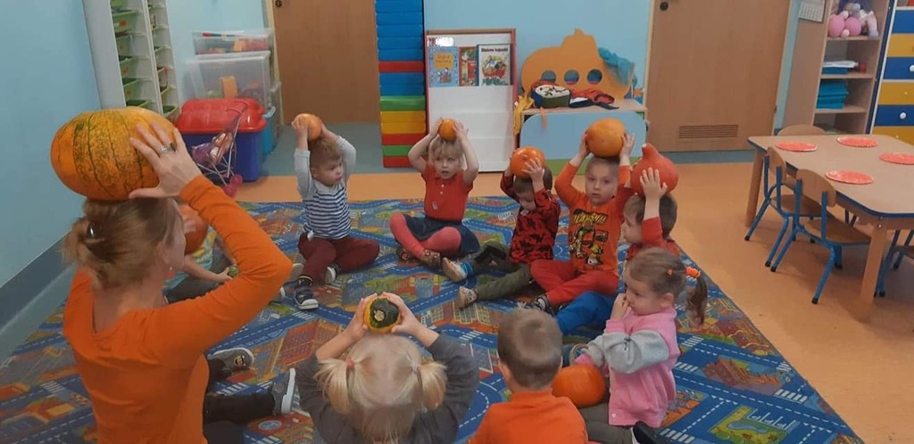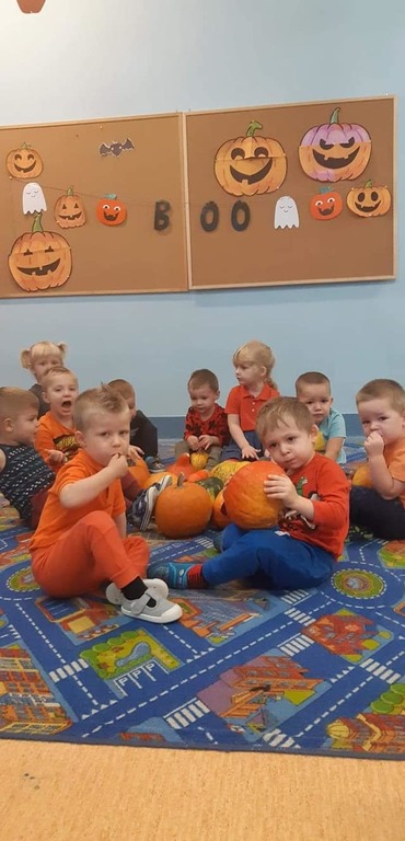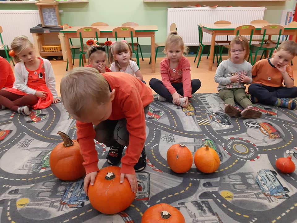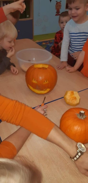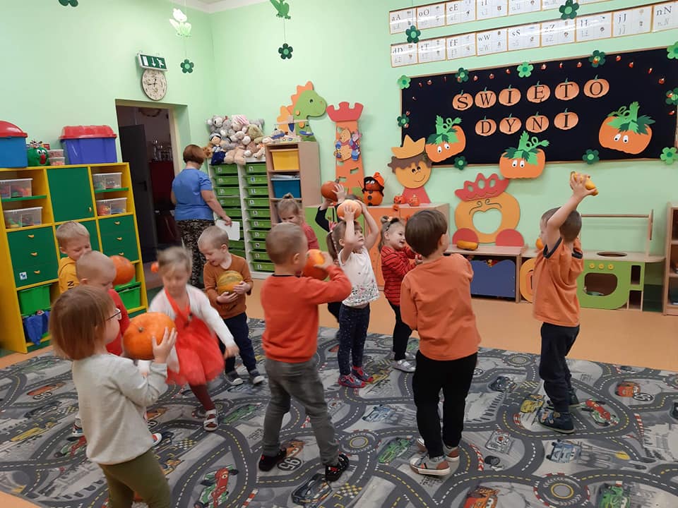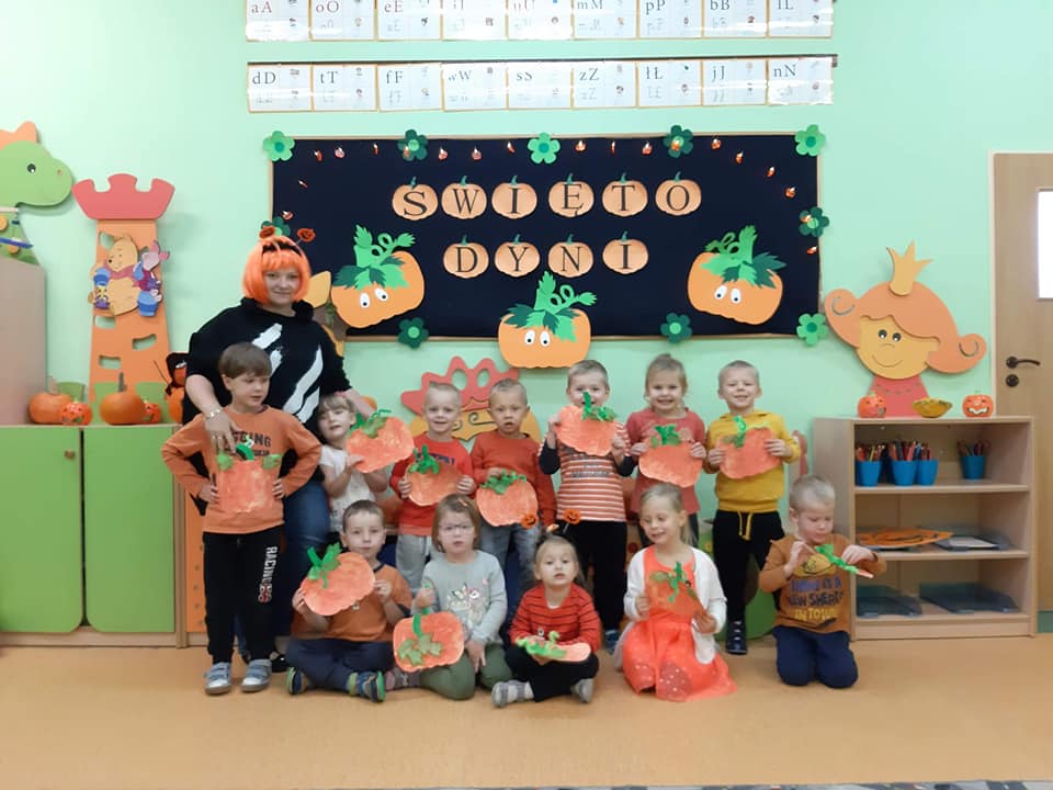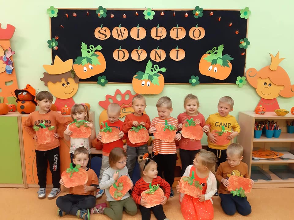 W dniu 28 października w naszym przedszkolu obchodziliśmy "Dzień Dyni" . Wszystkie dzieci w tym dniu przyszły ubrane na pomarańczowo i przyniosły ze sobą dynię - małą albo dużą, ale nie to było najważniejsze. Dzisiejsze przedpołudnie wypełnione było licznymi zabawami i zadaniami. Na początku była rymowanka : jak przyjemnie i wesoło kiedy dynia krąży w koło... Następnie we wszystkich grupach dzieci poznały gatunki dyń i roślin dyniowatych, dowiedziały się jakie smakołyki można z niej przygotować oraz zajrzały do wnętrza warzywa - zrobiliśmy lampion z dyni. Kolejny punkt to dyniowe zabawy; slalom, kręgle, wyścigi, taniec, matematyka, oczywiście wszystko z dynią i we wszystkich grupach. Na zakończenie dyniowego święta każdy przedszkolak wykonał pracę plastyczną - dynię. Przed obiadem Żabki wysłuchały jeszcze bajki "Kopciuszek " - kareta Kopciuszka to przecież dynia, a Biedronki i Pszczółki obejrzały piosenkę o liczeniu dyń, dyń dyń.