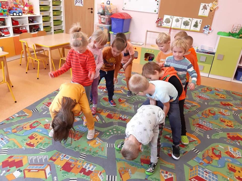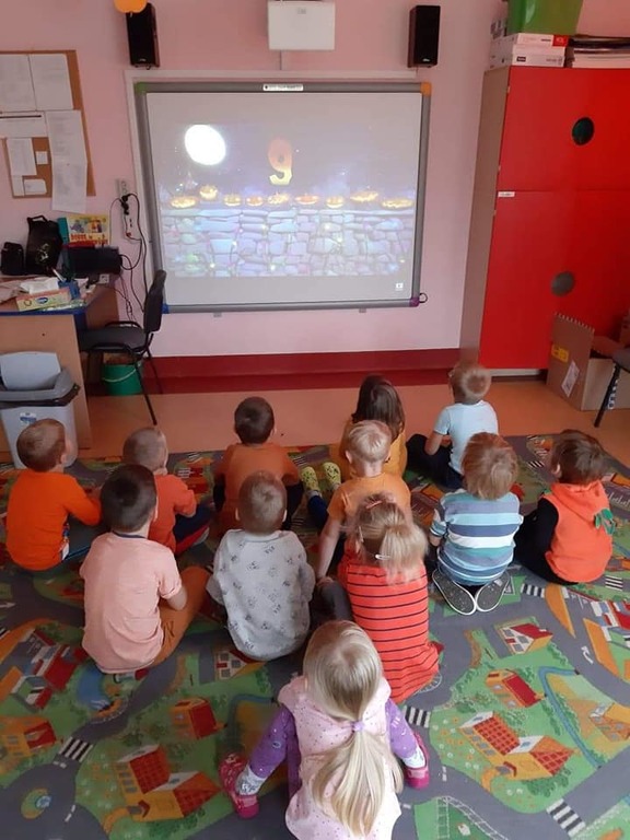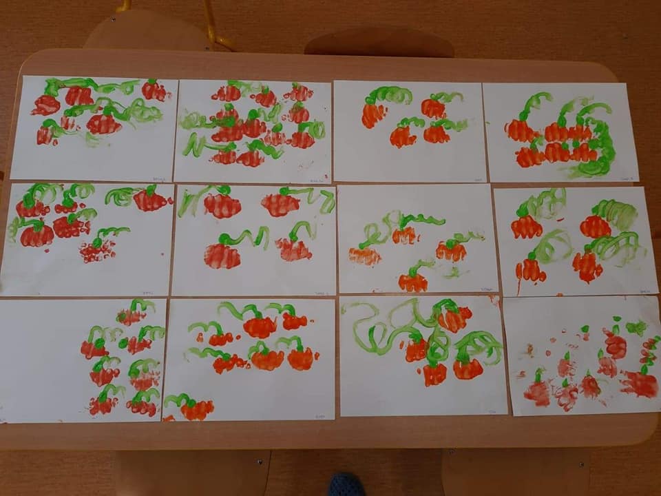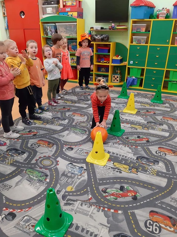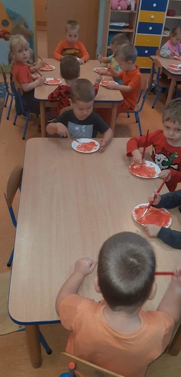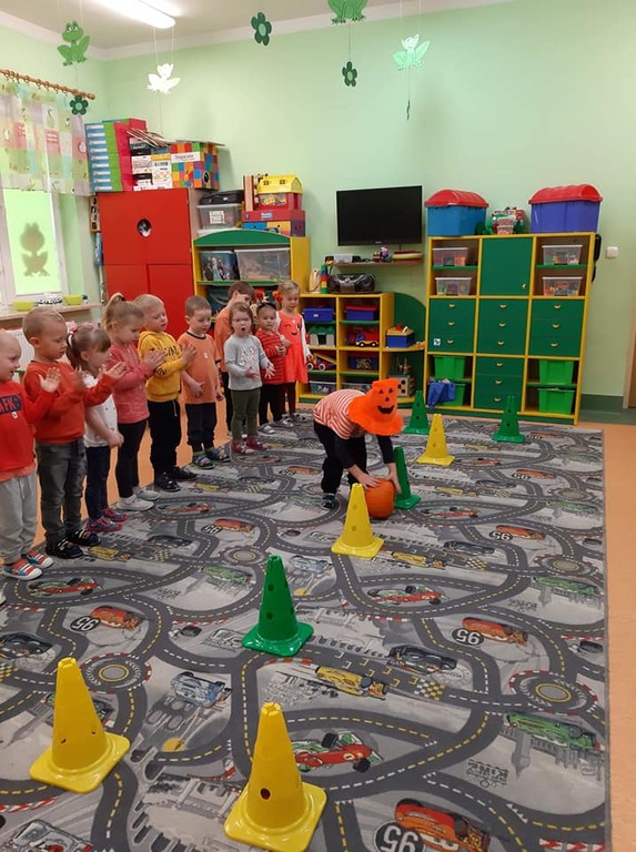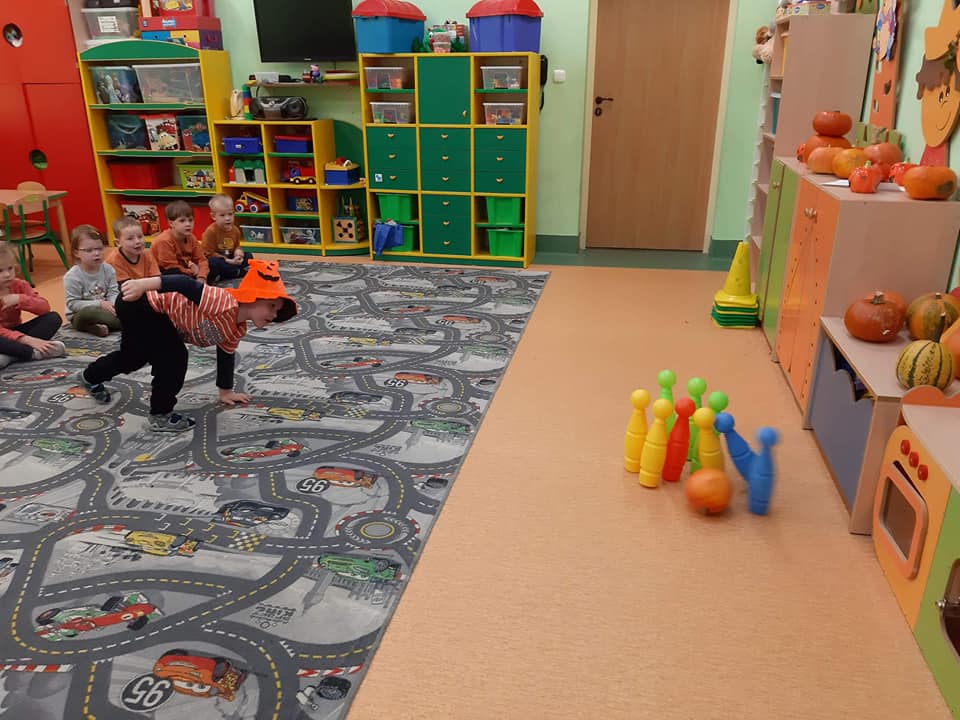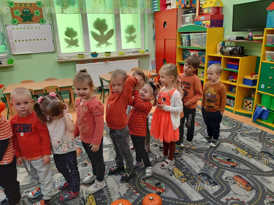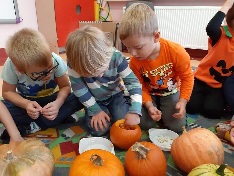 W dniu 28 października w naszym przedszkolu obchodziliśmy "Dzień Dyni" . Wszystkie dzieci w tym dniu przyszły ubrane na pomarańczowo i przyniosły ze sobą dynię - małą albo dużą, ale nie to było najważniejsze. Dzisiejsze przedpołudnie wypełnione było licznymi zabawami i zadaniami. Na początku była rymowanka : jak przyjemnie i wesoło kiedy dynia krąży w koło... Następnie we wszystkich grupach dzieci poznały gatunki dyń i roślin dyniowatych, dowiedziały się jakie smakołyki można z niej przygotować oraz zajrzały do wnętrza warzywa - zrobiliśmy lampion z dyni. Kolejny punkt to dyniowe zabawy; slalom, kręgle, wyścigi, taniec, matematyka, oczywiście wszystko z dynią i we wszystkich grupach. Na zakończenie dyniowego święta każdy przedszkolak wykonał pracę plastyczną - dynię. Przed obiadem Żabki wysłuchały jeszcze bajki "Kopciuszek " - kareta Kopciuszka to przecież dynia, a Biedronki i Pszczółki obejrzały piosenkę o liczeniu dyń, dyń dyń.