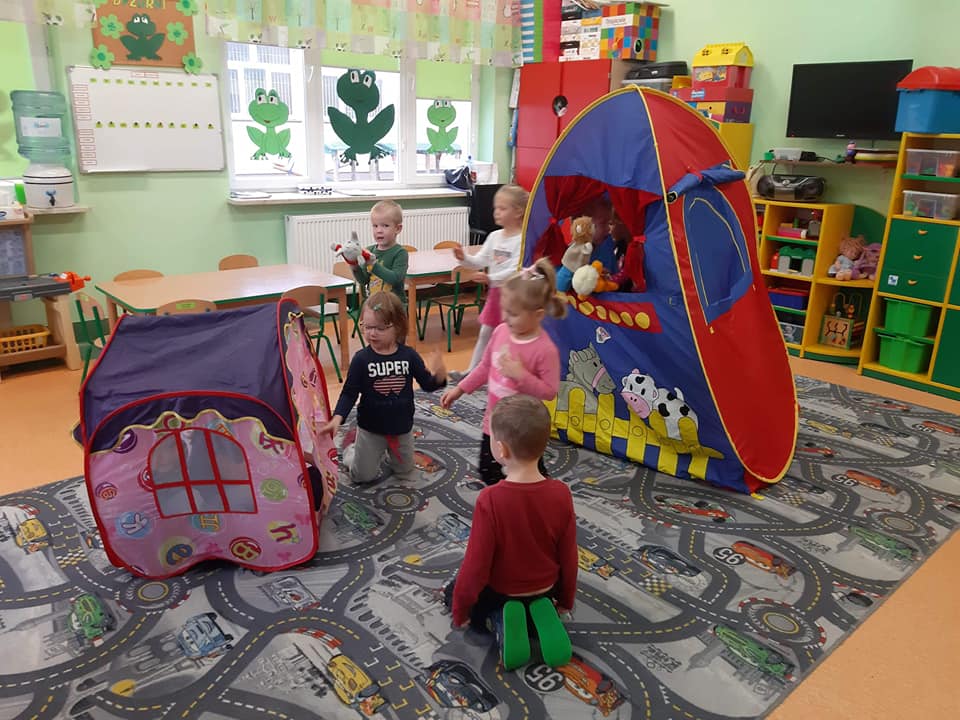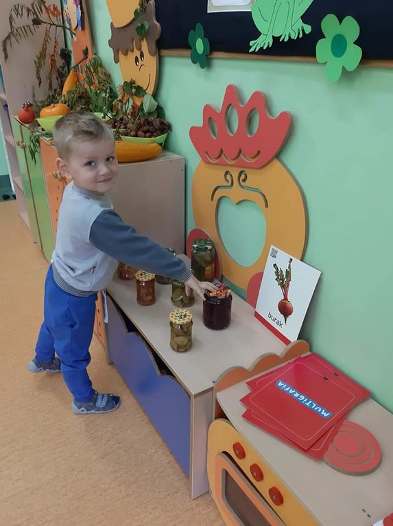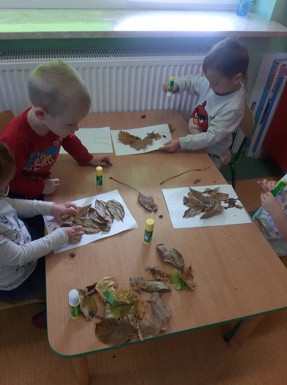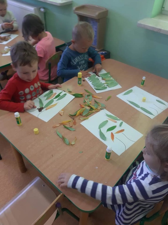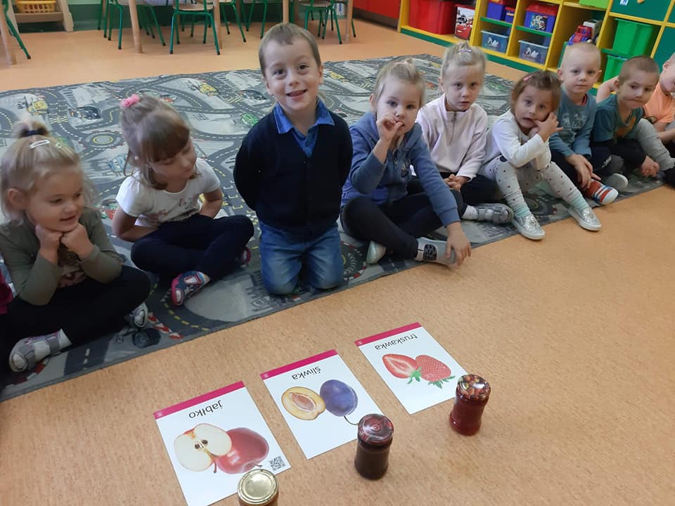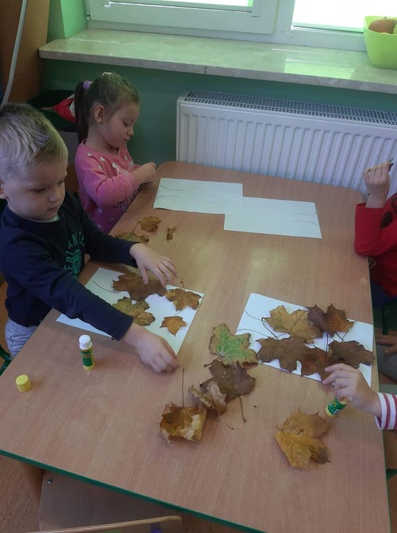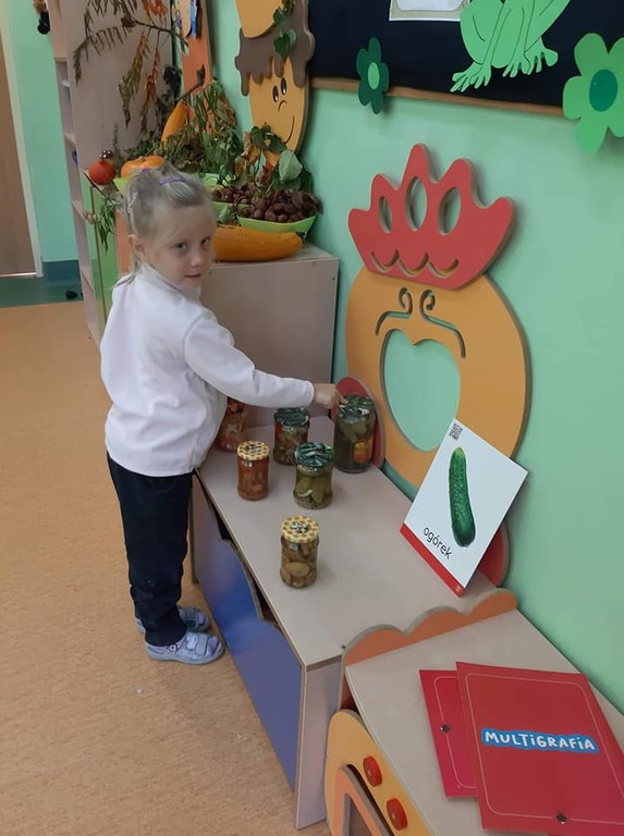 W październiku dzieci z grupy Żabki poznawały dary jesieni. Dzieci rozwiązywały zagadki na ich temat oraz segregowały poszczególne dary na kategorie: owoce, warzywa, grzyby, owoce drzew leśnych. Uczyły się rozpoznawać liście i łączyć je z odpowiednim owocem. Ćwiczyły rozróżnianie i nazywanie różnych owoców i warzyw, wąchały je i smakowały. Uczyły się w jakiej postaci warzywa i owoce mogą przetrwać zimę. Na podstawie doświadczeń i opowiadania „Ałła gorące” G. Kadsepke uczyliśmy się zasad bezpiecznego zachowania w kuchni. Sprawdzaliśmy jak wygląda piramida zdrowego żywienia. Żabki dowiedziały się jak wygląda jesień w parku i w lesie, obserwowaliśmy zmiany zachodzące w przyrodzie i zbieraliśmy jesienne skarby. Poznaliśmy zimowe zwyczaje niektórych zwierząt. Poprzez zabawy, prace plastyczne uczyliśmy się rozpoznawać barwy podstawowe i pochodne. Rozmawialiśmy również o tym kim jest artysta. Bawiliśmy się w teatr i przypominaliśmy zasady zachowania w teatrze. Interpretowaliśmy utwór muzyczny za pomocą ruchu, tworzyliśmy makiety z materiałów przyrodniczych. W ostatnim tygodniu października rozmawialiśmy o rodzinie, także o zmarłych członkach rodziny oraz o tym w jaki sposób możemy ich wspominać i dlaczego odwiedzamy groby. Tworzyliśmy wspólnie drzewa genealogiczne rodziny. Uczyliśmy się globalnego czytania wyrazów: mama, tata, siostra, brat oraz prawidłowego nazywania krewnych. Poznaliśmy zabawy, w które bawili się nasi dziadkowie W miesiącu październiku oprócz piosenek porannych poznaliśmy trzy nowe piosenki: „Zbieramy grzyby’, „Na chłodne dni” oraz „Farby”. Wykonaliśmy dużo prac plastycznych, które można było podziwiać na naszej tablicy w szatni.