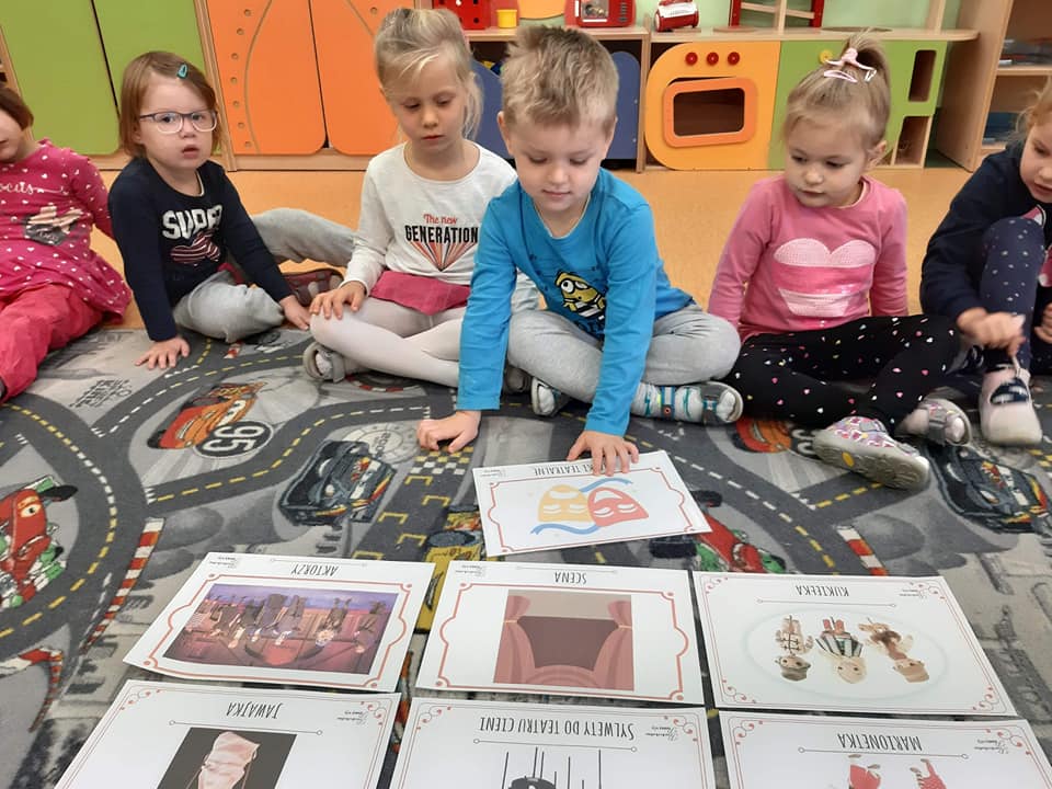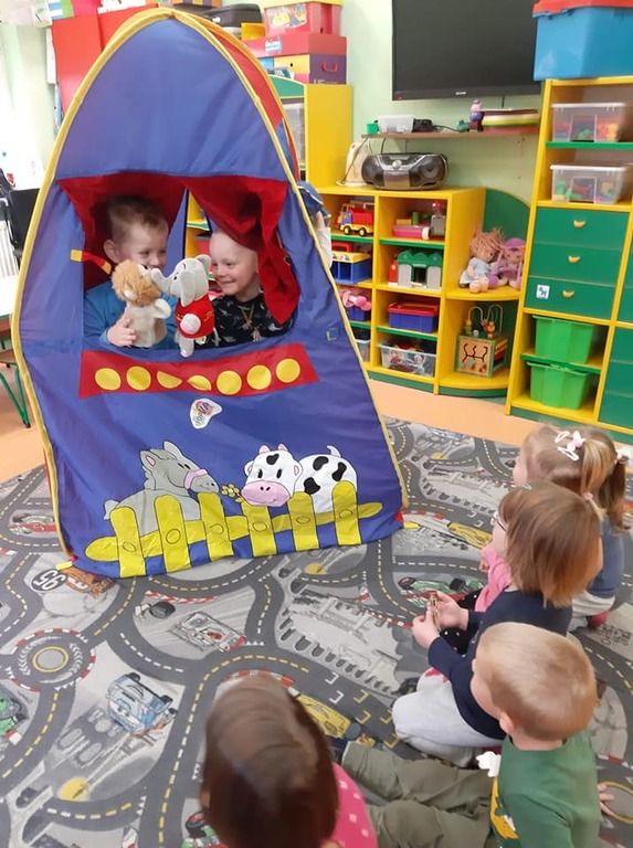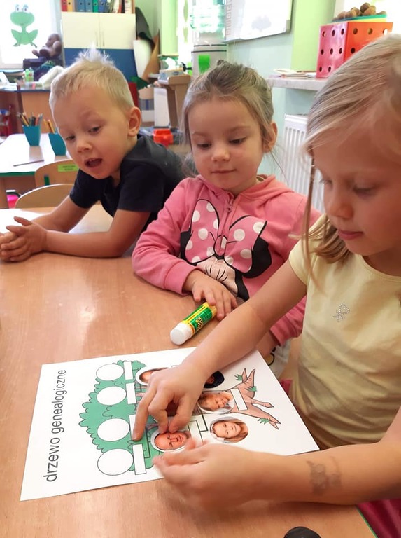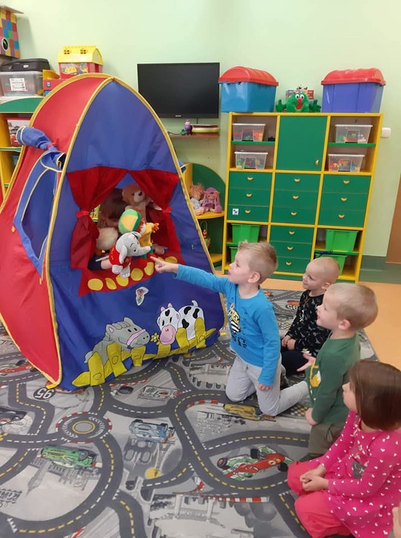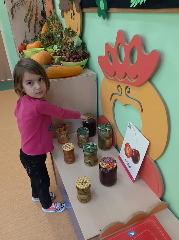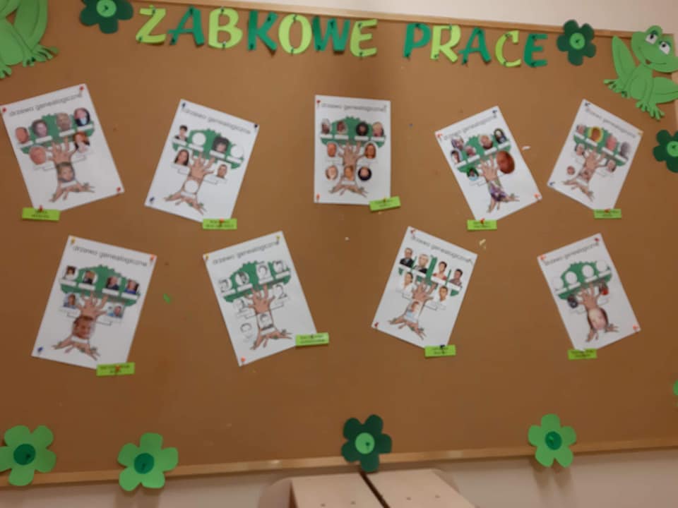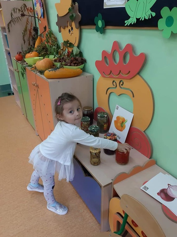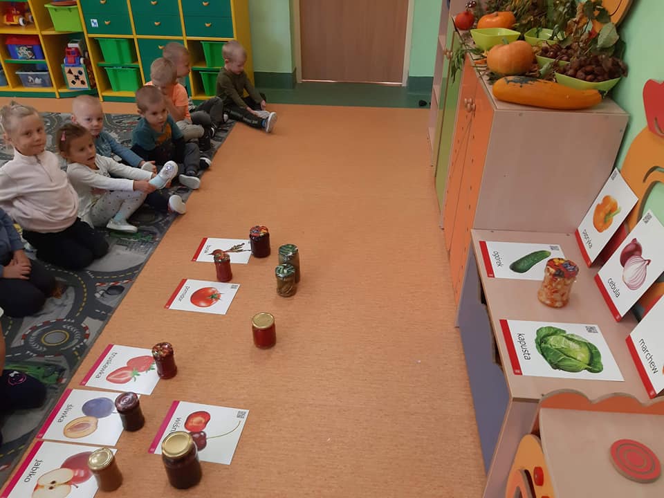 W październiku dzieci z grupy Żabki poznawały dary jesieni. Dzieci rozwiązywały zagadki na ich temat oraz segregowały poszczególne dary na kategorie: owoce, warzywa, grzyby, owoce drzew leśnych. Uczyły się rozpoznawać liście i łączyć je z odpowiednim owocem. Ćwiczyły rozróżnianie i nazywanie różnych owoców i warzyw, wąchały je i smakowały. Uczyły się w jakiej postaci warzywa i owoce mogą przetrwać zimę. Na podstawie doświadczeń i opowiadania „Ałła gorące” G. Kadsepke uczyliśmy się zasad bezpiecznego zachowania w kuchni. Sprawdzaliśmy jak wygląda piramida zdrowego żywienia. Żabki dowiedziały się jak wygląda jesień w parku i w lesie, obserwowaliśmy zmiany zachodzące w przyrodzie i zbieraliśmy jesienne skarby. Poznaliśmy zimowe zwyczaje niektórych zwierząt. Poprzez zabawy, prace plastyczne uczyliśmy się rozpoznawać barwy podstawowe i pochodne. Rozmawialiśmy również o tym kim jest artysta. Bawiliśmy się w teatr i przypominaliśmy zasady zachowania w teatrze. Interpretowaliśmy utwór muzyczny za pomocą ruchu, tworzyliśmy makiety z materiałów przyrodniczych. W ostatnim tygodniu października rozmawialiśmy o rodzinie, także o zmarłych członkach rodziny oraz o tym w jaki sposób możemy ich wspominać i dlaczego odwiedzamy groby. Tworzyliśmy wspólnie drzewa genealogiczne rodziny. Uczyliśmy się globalnego czytania wyrazów: mama, tata, siostra, brat oraz prawidłowego nazywania krewnych. Poznaliśmy zabawy, w które bawili się nasi dziadkowie W miesiącu październiku oprócz piosenek porannych poznaliśmy trzy nowe piosenki: „Zbieramy grzyby’, „Na chłodne dni” oraz „Farby”. Wykonaliśmy dużo prac plastycznych, które można było podziwiać na naszej tablicy w szatni.