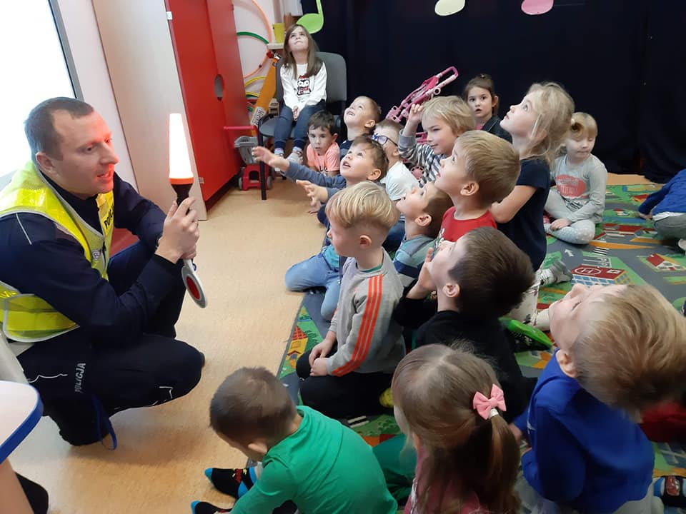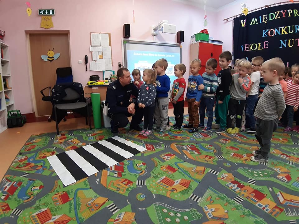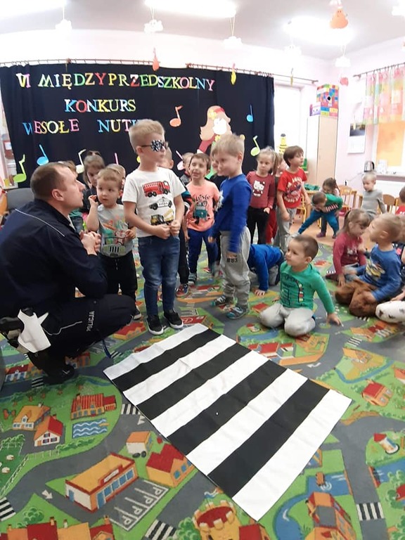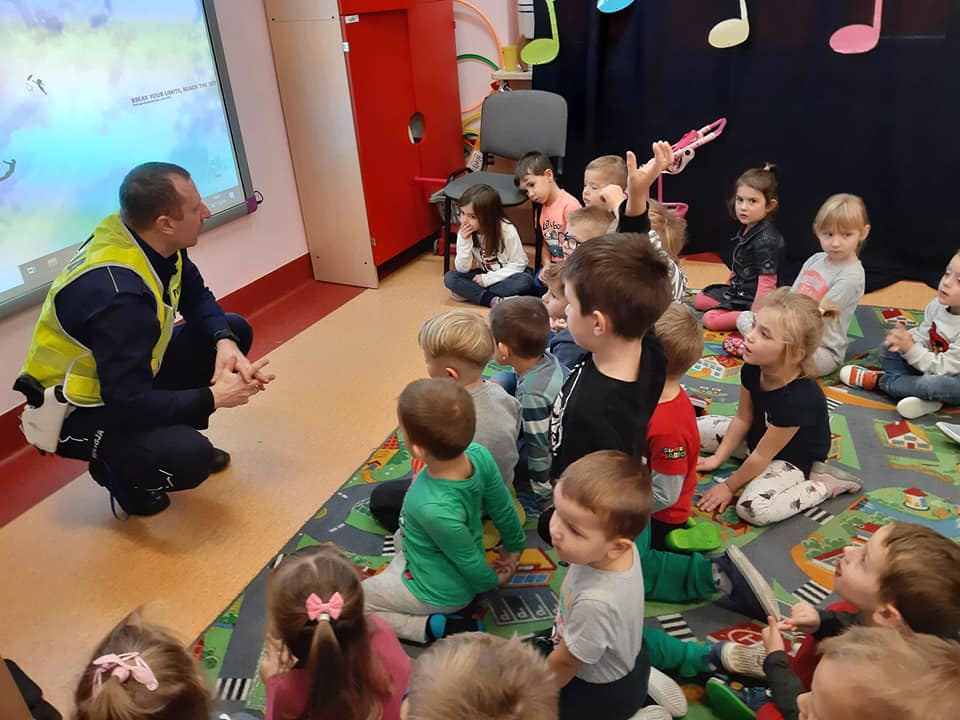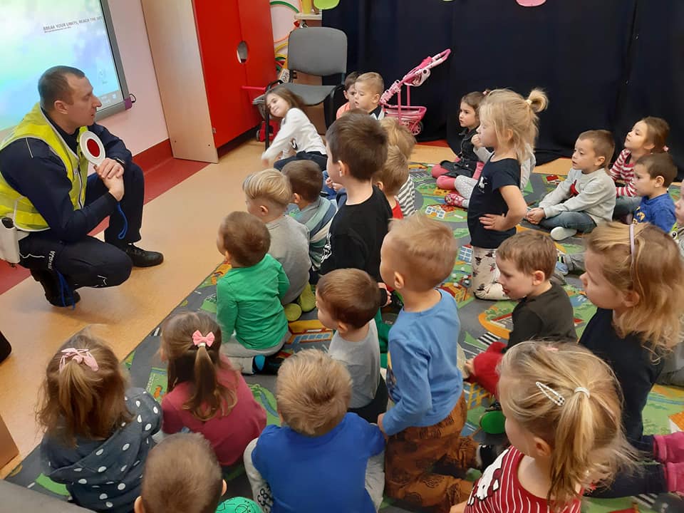 Przedszkolaki dowiedziały się jak ważna, odpowiedzialna i niebezpieczna jest praca policjanta. Duże zainteresowanie u dzieci wywołało umundurowanie i wyposażenie policjanta. Było to bardzo ciekawe i pouczające spotkanie dotyczące zasad bezpieczeństwa, które na pewno długo pozostanie w pamięci naszych dzieci.