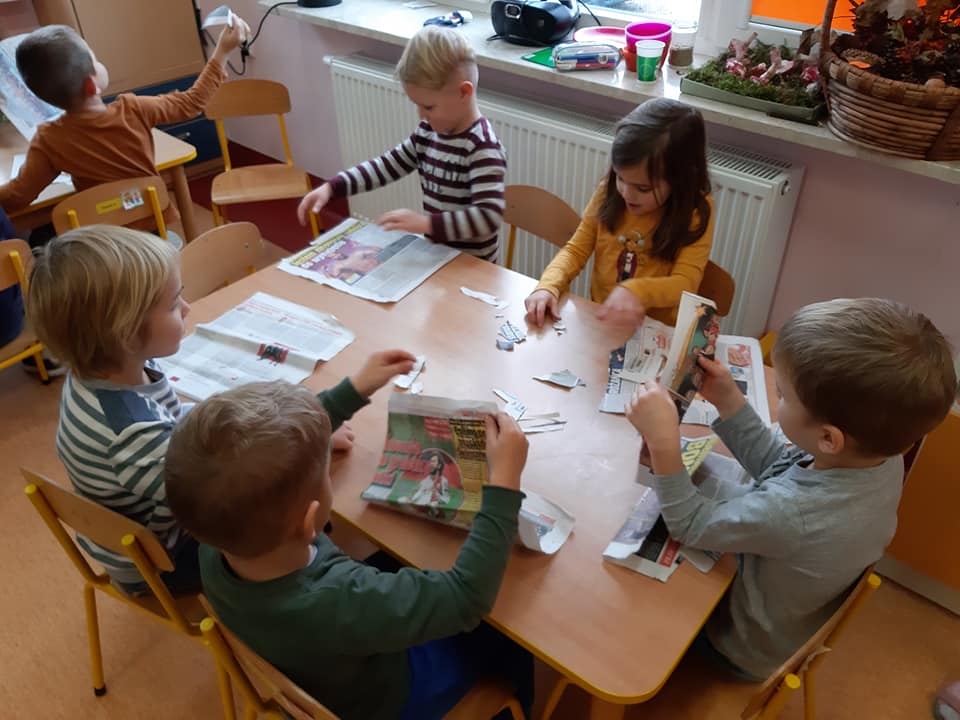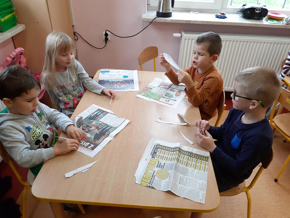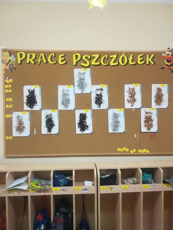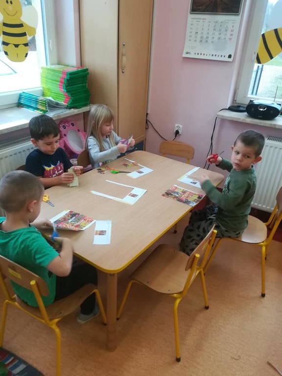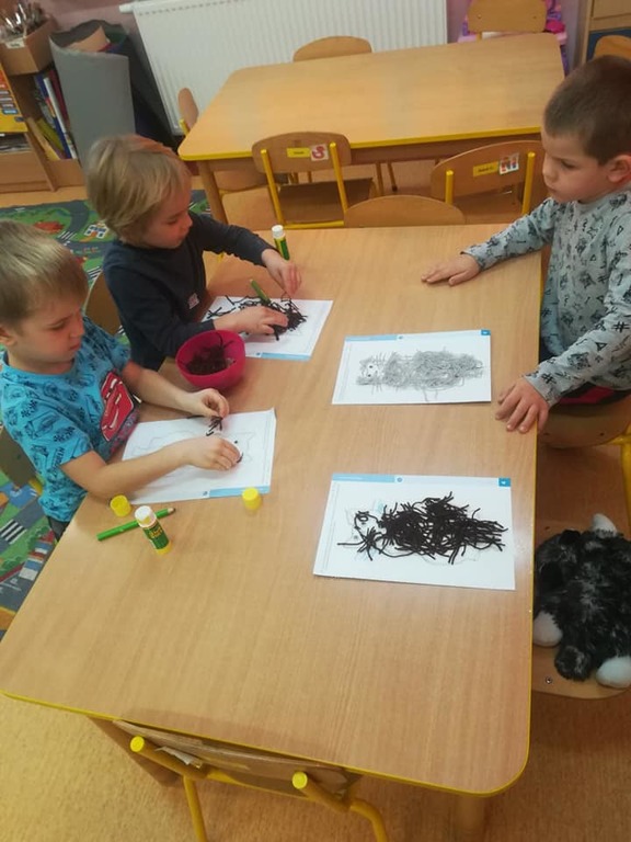 Pszczółki miały okazję do pochwalenia się wiedzą i doświadczenieniami związanymi z hodowaniem domowego pupila. Przedszkolaki wiedzą już bardzo dużo na temat opieki nad zwierzętami, sposobów ich dokarmiania czy wizyt u weterynarza. Na tablicy przedszkolnej zawiesiliśmy prace dzieci wykonane z gazet ilustrujące ich ulubione zwierzęta. Wydzieranki nie należą do najprostrzych form plastycznych, a nasze Pszczółki świetnie sobie z nimi poradziły.