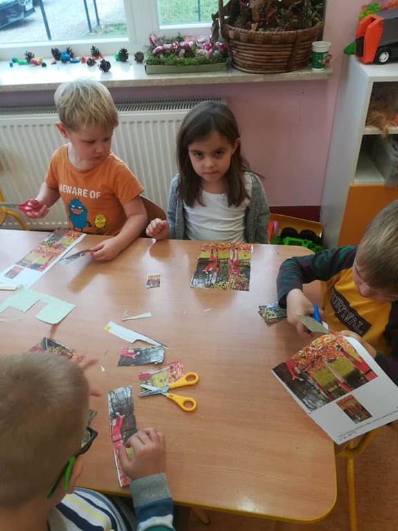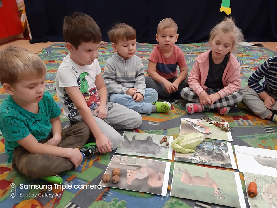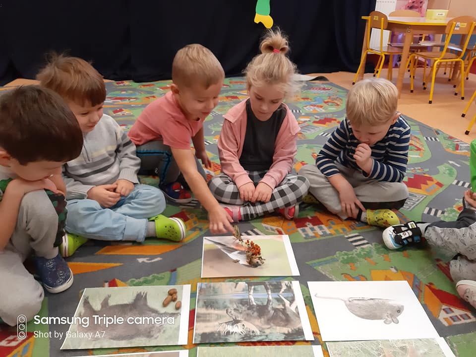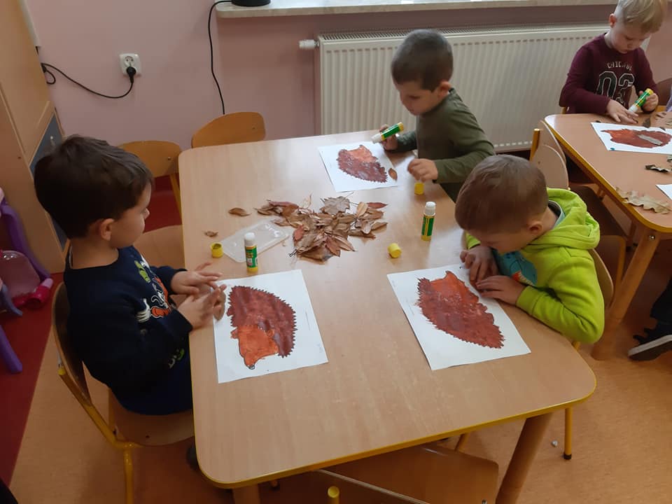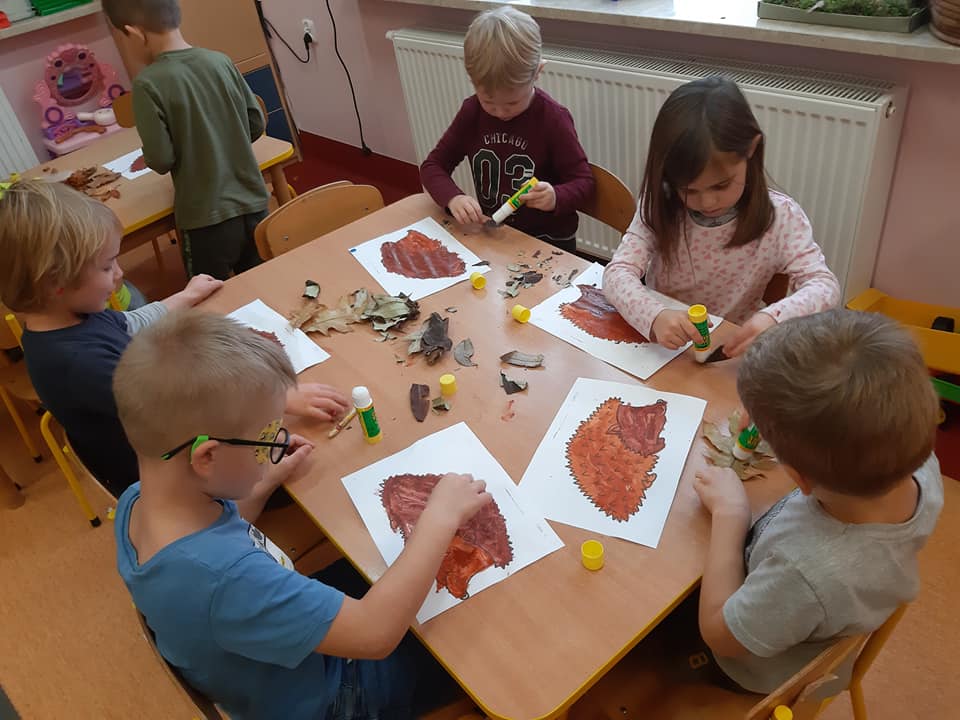 Mamy za sobą także pierwszy temat dotyczący zbliżającej się zimy. Dzieci z zapałem rozwiązywały zagadki o zwierzętach leśnych. Dowiedziały się, w jaki sposób różne zwierzęta przygotowują się do zimy. Odkryły, że niektóre z nich zapadają w sen zimowy, inne hibernują czy chowają się np.pod liśćmi. Stworzyliśmy pracę plastyczną z wykorzystaniem surowców naturalnych ,,Jeż w liściach".