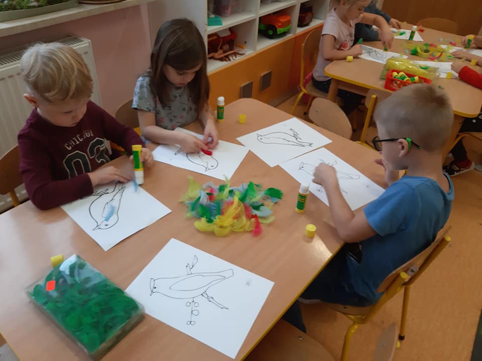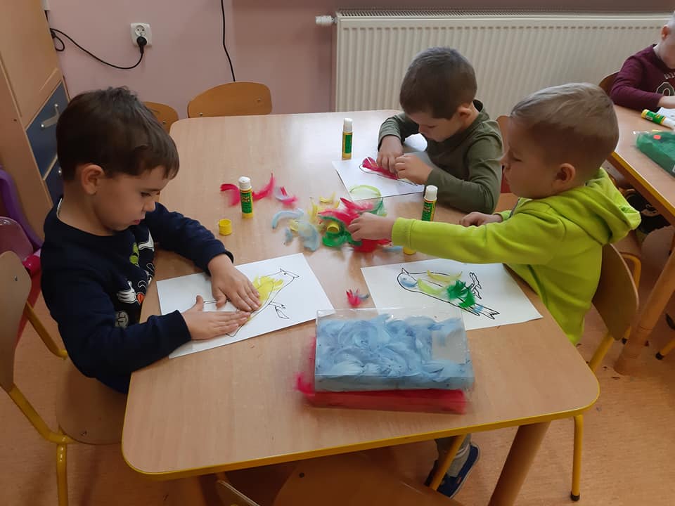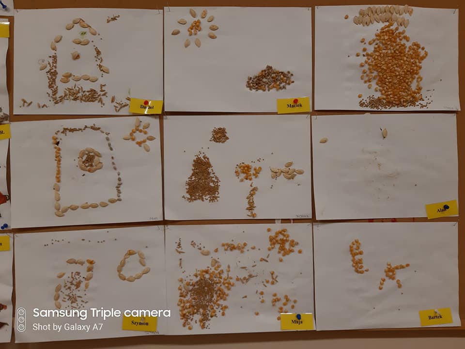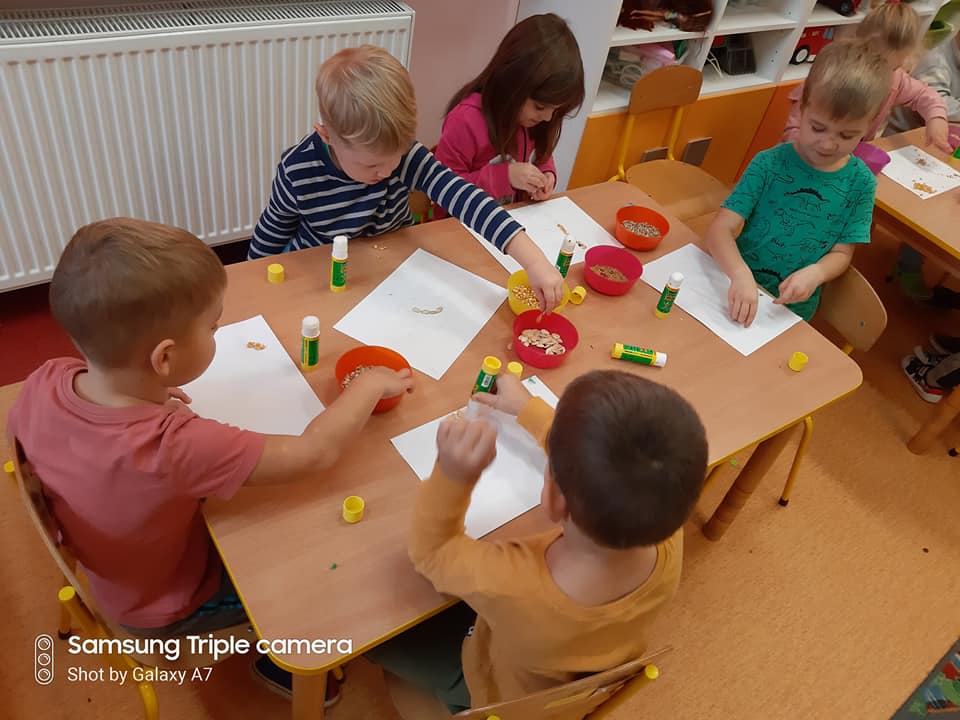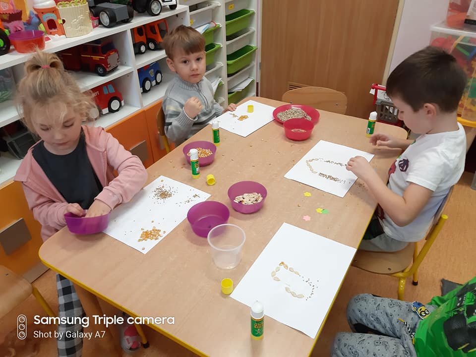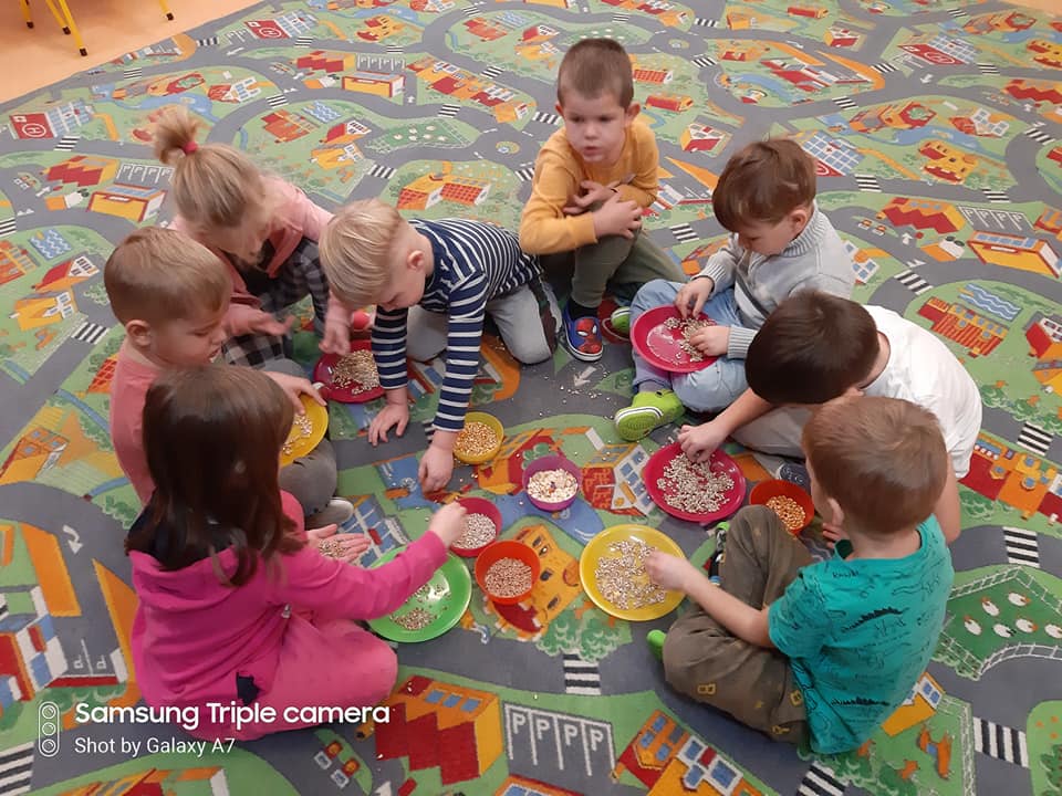 Pszczółki dowiedziały się, jak i czym dokarmiać zwierzęta zimujące w Polsce oraz czym się różni karmnik od paśnika. Rozpoznawaliśmy zapasy dla zwierząt po dotyku, przyporządkowaliśmy zapasy do zdjęć zwierząt. Poznaliśmy również ptaki pozostające w kraju i odlatujące na zimę. Przedszkolaki poznały budowę ciała ptaka, wykonały serię ekesperymentów z piórkami. Na koniec wykonały pracę plastyczną. Dzieci otrzymały zmieszane także nasiona. Zadaniem ich było rozdzielenie ziarna na grupy jednego rodzaju. Na koniec zajęć stworzyliśmy ,,obrazy z ziaren".