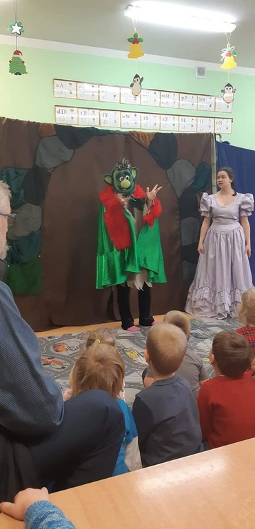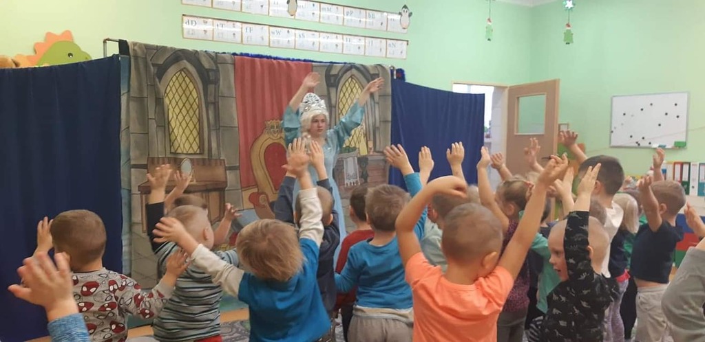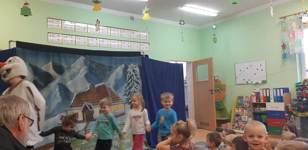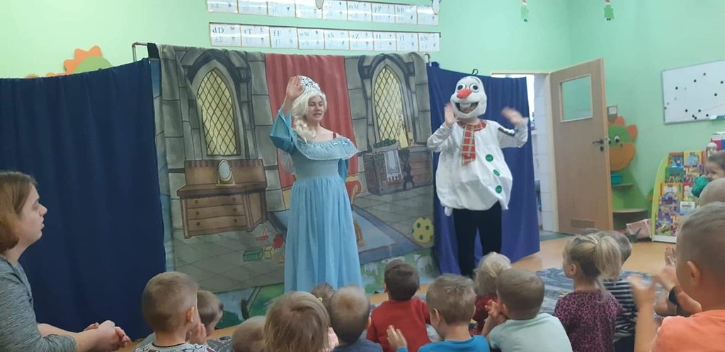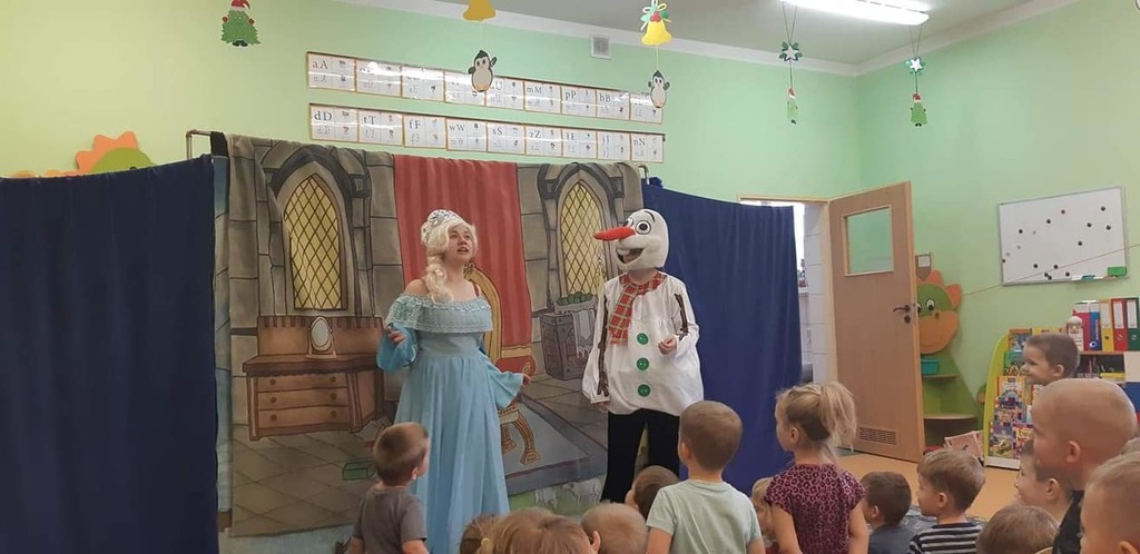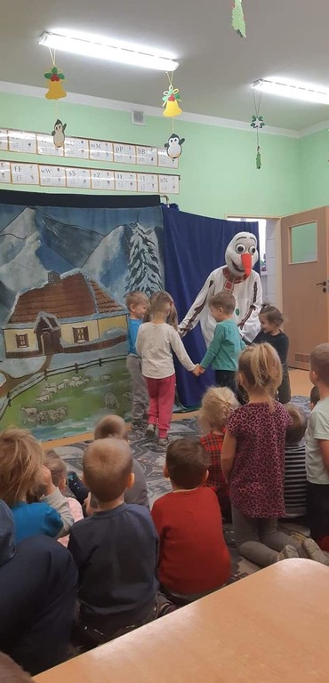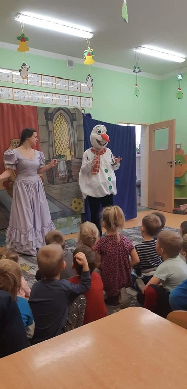 11.12 odwiedził nasze przedszkole teatrzyk z Krakowa z przedstawieniem "Świąteczna gorączka Olafa." W królestwie, w którym mieszkają siostry Anna i Elza zbliżają się święta Bożego Narodzenia. Siostry są szczęśliwe, gdyż po raz pierwszy od dawna będą mogły spędzić ten czas razem, a Olaf nie może doczekać się prezentów. Radość z przygotowań zakłóca również fakt, że w królestwie nie ma tradycji świątecznych, dlatego Olaf wyrusza na poszukiwania. Pełne humoru i przygód przedstawienie o ulubieńcach z Lodowej Krainy. Dzieci poznały, co to miłość, przyjaźń i wzajemna współpraca. Dzieci były zachwycone...
