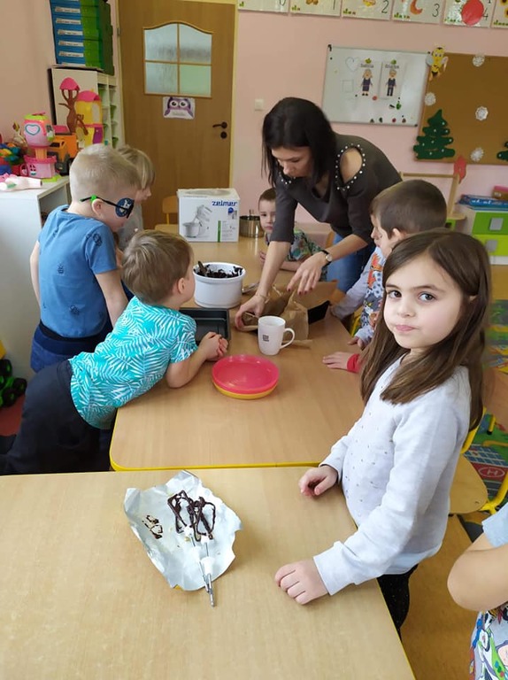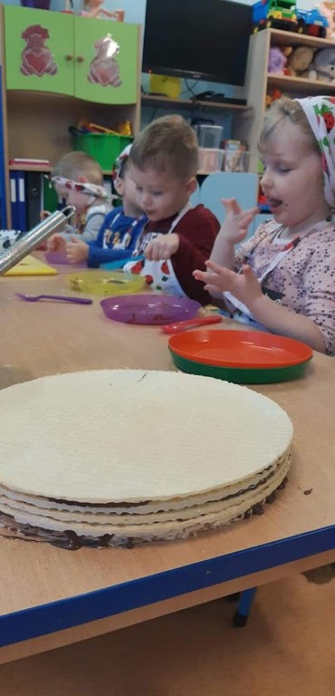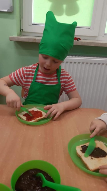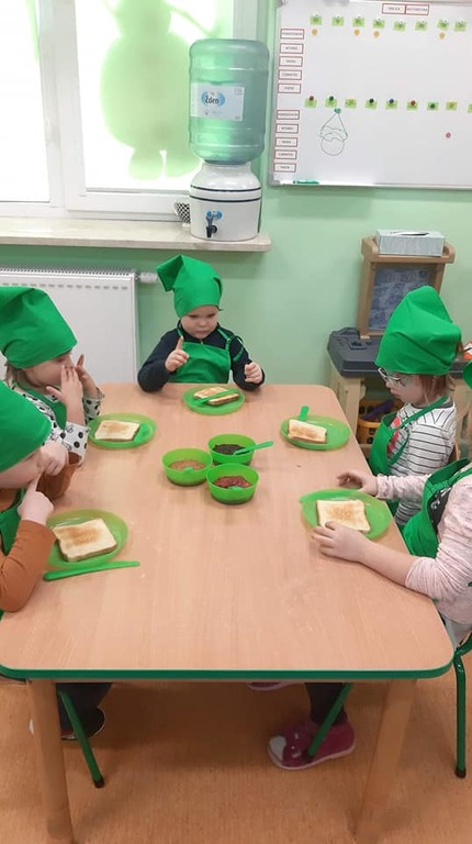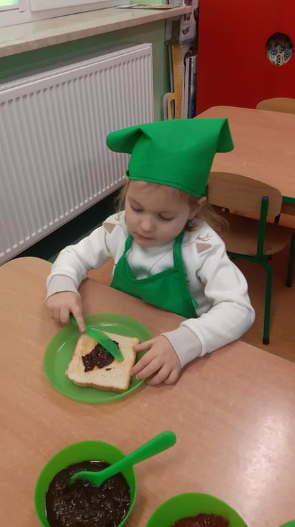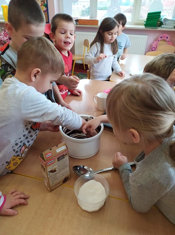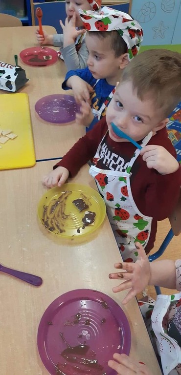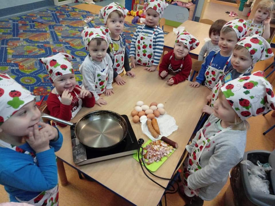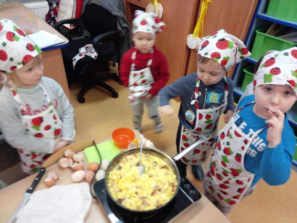 W stycznia dzieci z przedszkola mogą pochwalić się sukcesami kulinarnymi. Grupa Biedronek smażyła jajecznicę oraz wafle. Żabki przygotowały tosty, a Pszczółki robiły blok czekoladowy.