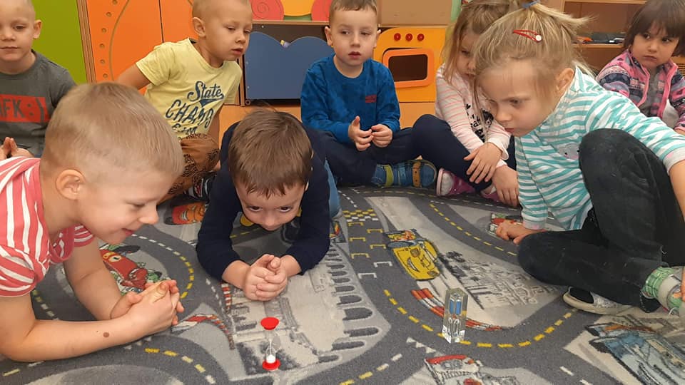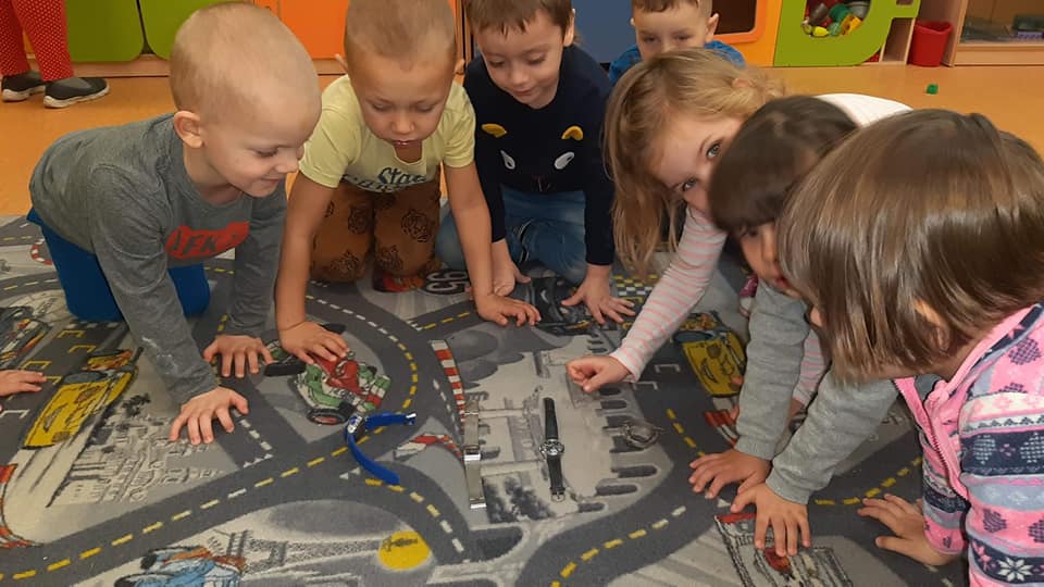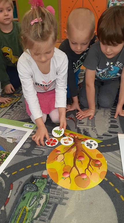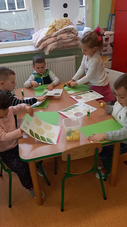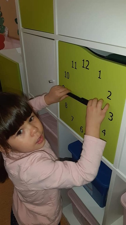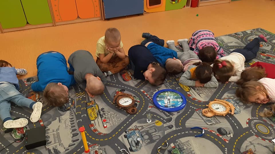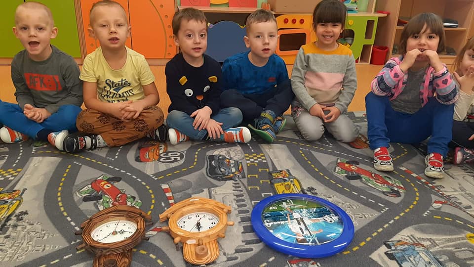 W nowym roku kalendarzowym rozmawialiśmy o postanowieniach noworocznych i sposobach mierzenia czasu. Przypominaliśmy sobie i poznawaliśmy nazwy pór roku, miesięcy i dni tygodnia. Nauczyliśmy się piosenki „Tydzień ma siedem dni”. Przedszkolaki uczyły się globalnego czytania wyrazu zegar i mówiły o tym, do czego służy, jakie są rodzaje zegarów i jakie wydają dźwięki. Żabki rozmawiały o cechach charakterystycznych pór roku i stworzyły zegar pór roku.