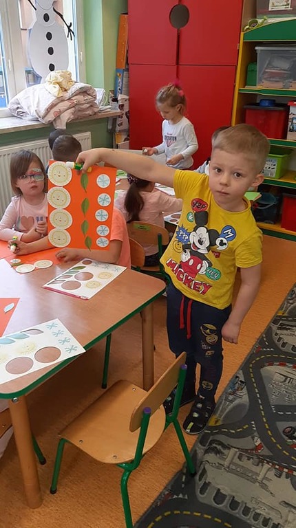 W kolejnym tygodniu zajmowaliśmy się zjawiskami atmosferycznymi. Dzieci poznały zjawiska charakterystyczne dla zimy, nauczyły się piosenki z inscenizacją „Tupu tup po śniegu”, bawiły się w zabawy paluszkowe. Wykonały prace plastyczne związane z zimową porą. Na podstawie opowiadania dzieci rozważały jak się ubrać, gdy jest zimno na dworze. Z pomocą plansz dydaktycznych uczyły się rozpoznawać tropy zwierząt na śniegu.