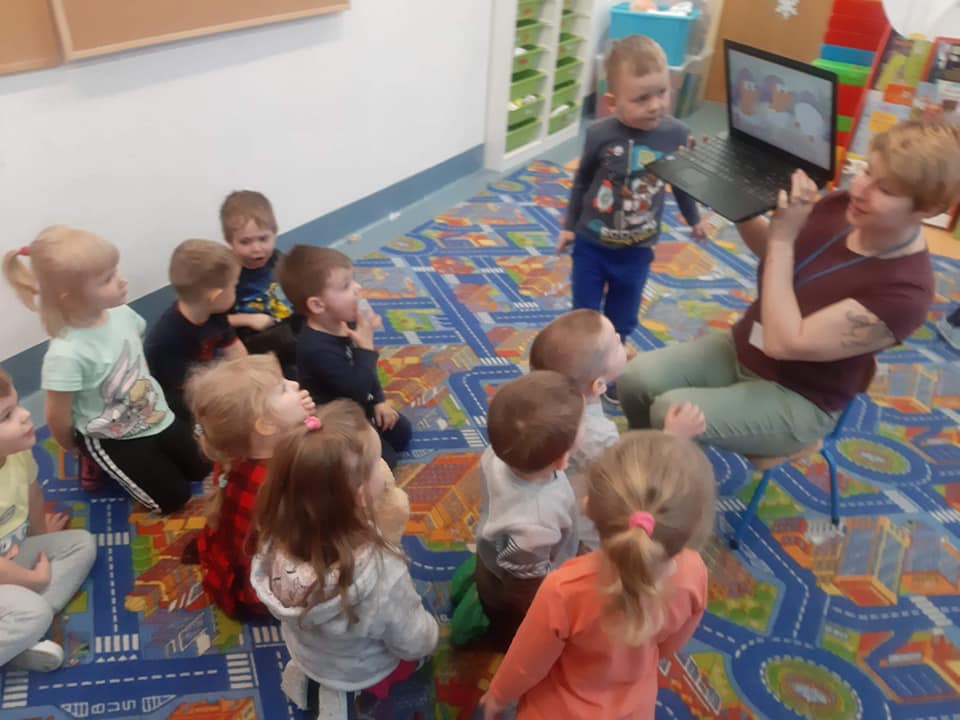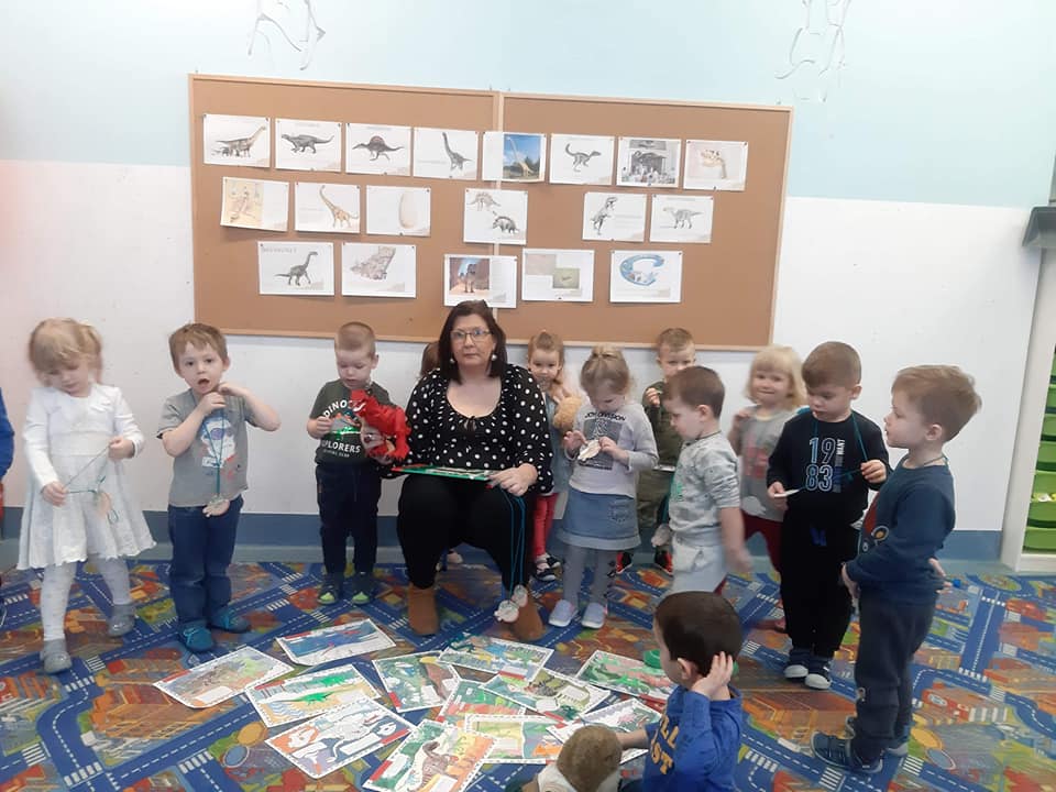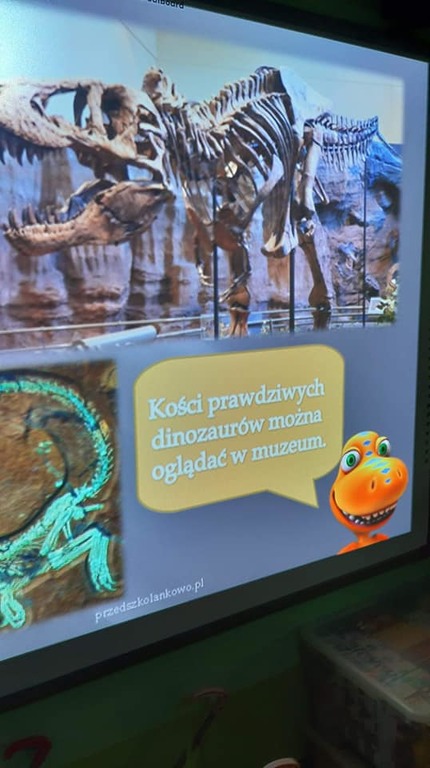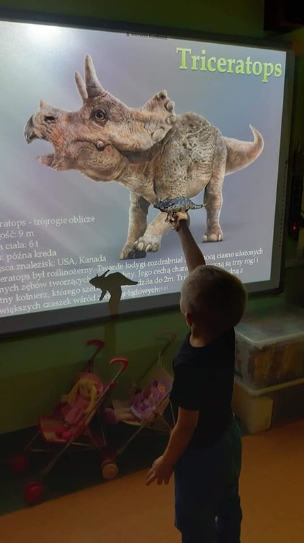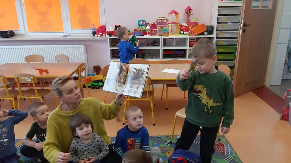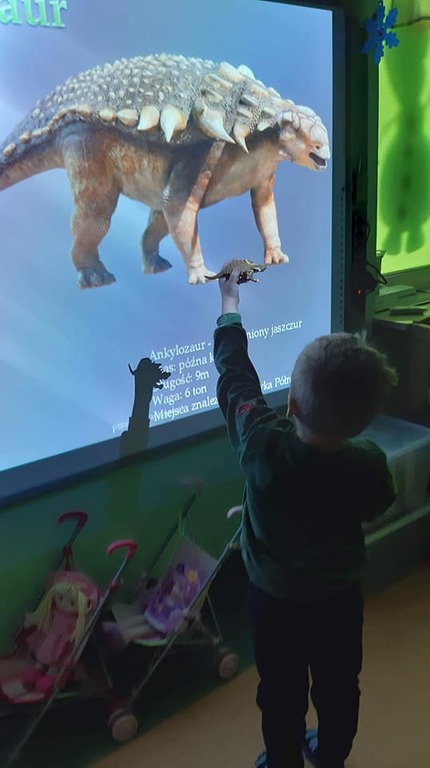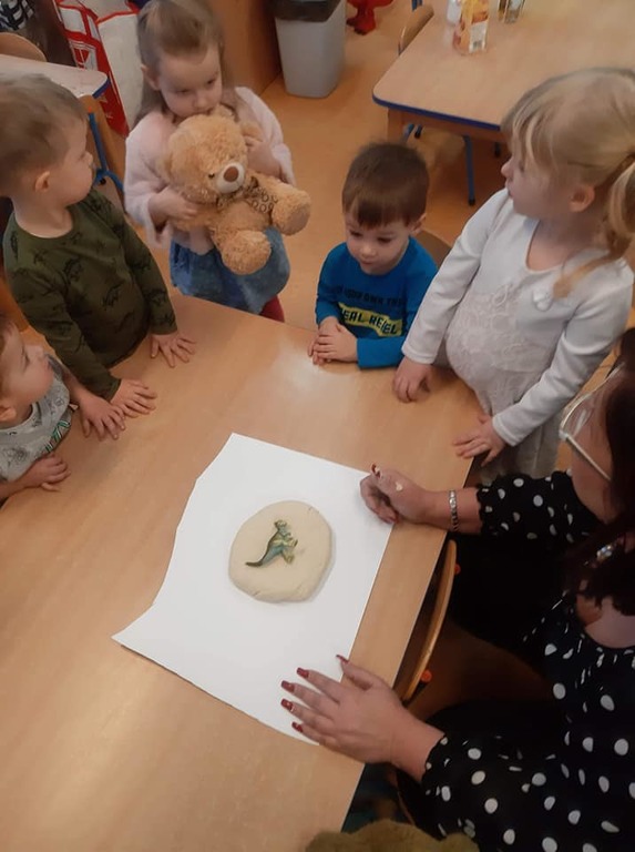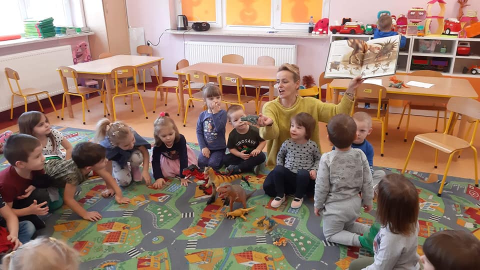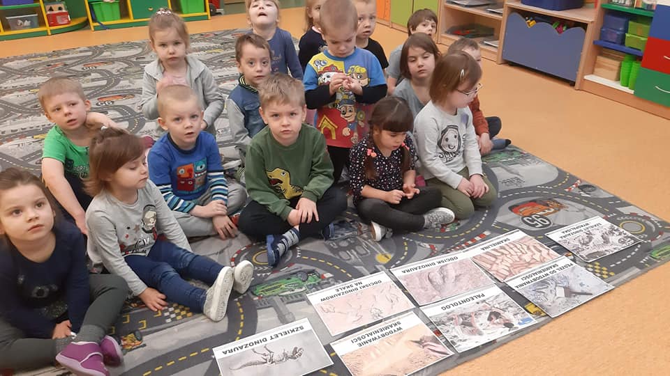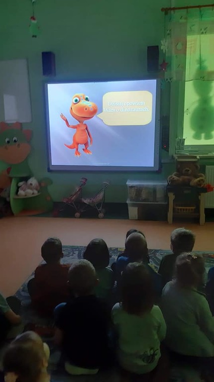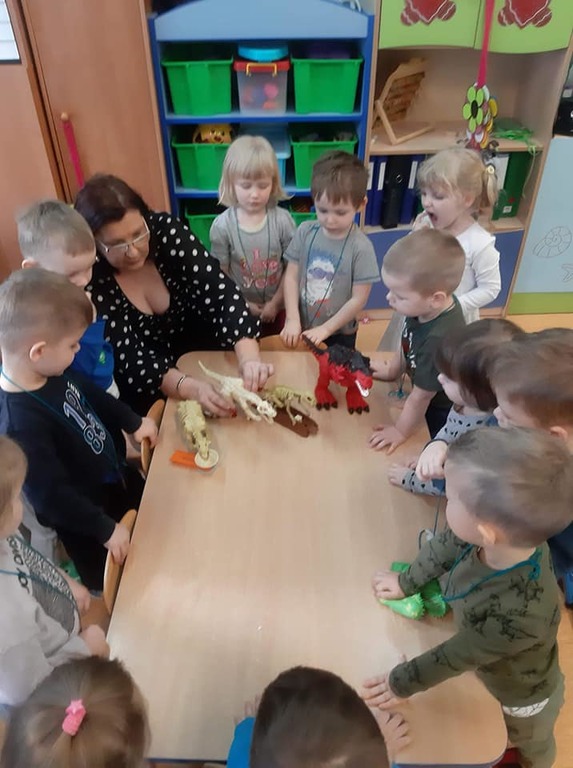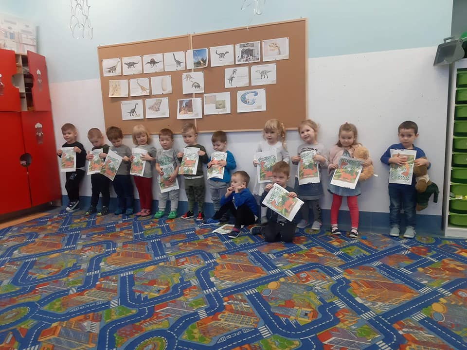 Dnia 26. 02. 2020 roku w naszym przedszkolu dzieci z grup Biedronki, Żabki i Pszczółki obchodziły Dzień Dinozaura. Maluchy rozpoczęły ten dzień od obejrzenia książek i albumów z tymi zwierzętami. Przy pomocy tablicy interaktywnej dzieciom została przedstawiona prezentacja na temat życia dinozaurów, była to doskonała okazja, aby przedszkolaki dowiedziały się ciekawostek o dinozaurach. Maluchom zostało wyjaśnione dlaczego te zwierzęta wyginęły i czym zajmuję się paleontologia. Dzieci doskonale się bawiły nazywając, przypominając sobie kolory, którymi mogły pokolorować zwierzęta i połączyć dinozaury w zbiory. Przedszkolaki nauczyły się piosenki pt. "Dino-zabawa w chowanego". Nasze pociechy wykonały także różne prace plastyczne: odciskały kształt dinozaura w masie solnej, kończyły wzór który znajdował się na grzbiecie zwierzęcia, układały puzzle z wyciętych elementow, wykonały dinozaury z literki b. Dzieci miały okazję obejrzeć miniatury szkieletów dinozaurów. W jednej z grup zrobiono gigantycznej wielkości jajo prachistorycznego ptaka. Maluszki nauczyły sie rymowanki, obejrzaly również film "Kraina gigantów". Zajęcia z angielskiego były również zbierzne z tym dniem. Dzieci nauczyły się piosenki w języku angielskim "Dziesięć dinozaurów". Aktywność maluchów była nagrodzona medalami i odznakami.