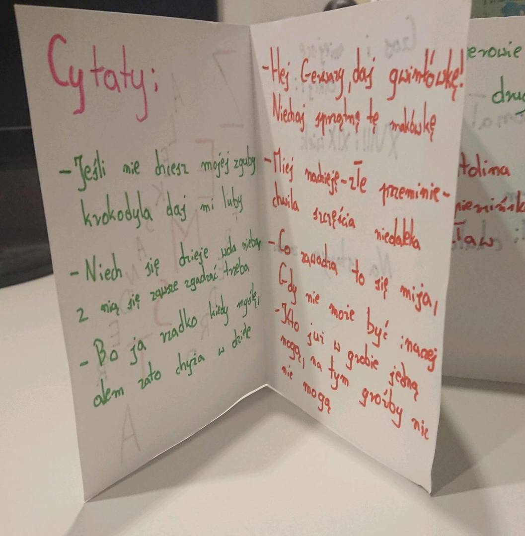 Najważniejszym elementem edukacji zdalnej są zadania, problemy do rozwiązania i pytania stawiane przed uczniami, które rozwijają ich kompetencje. Należy zadbać, aby uczniowie twórczo wykorzystali czas, a zadania im stawiane były powiązane z zainteresowaniami, szczególnie jeśli mogą być wykonywane bez kontaktu z komputerem, za to w interakcji zdalnej z rówieśnikami lub rodziną. Samodzielna nauka jest dla młodych ludzi trudna, dlatego warto poszukać sposobów, które bardziej ich zaangażują. Takim angażującym sposobem mogą być m. in. zadania problemowe, ciekawe pytania czy projekty do samodzielnego przeprowadzenia. Uczniowie klasy 7 podsumowując pracę z lekturą wykonali „laporello” - małe harmonijkowe książeczki, które będą mogli wykorzystać do powtórzenia materiału.