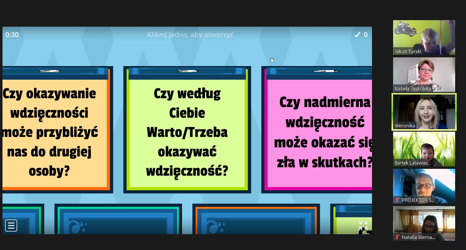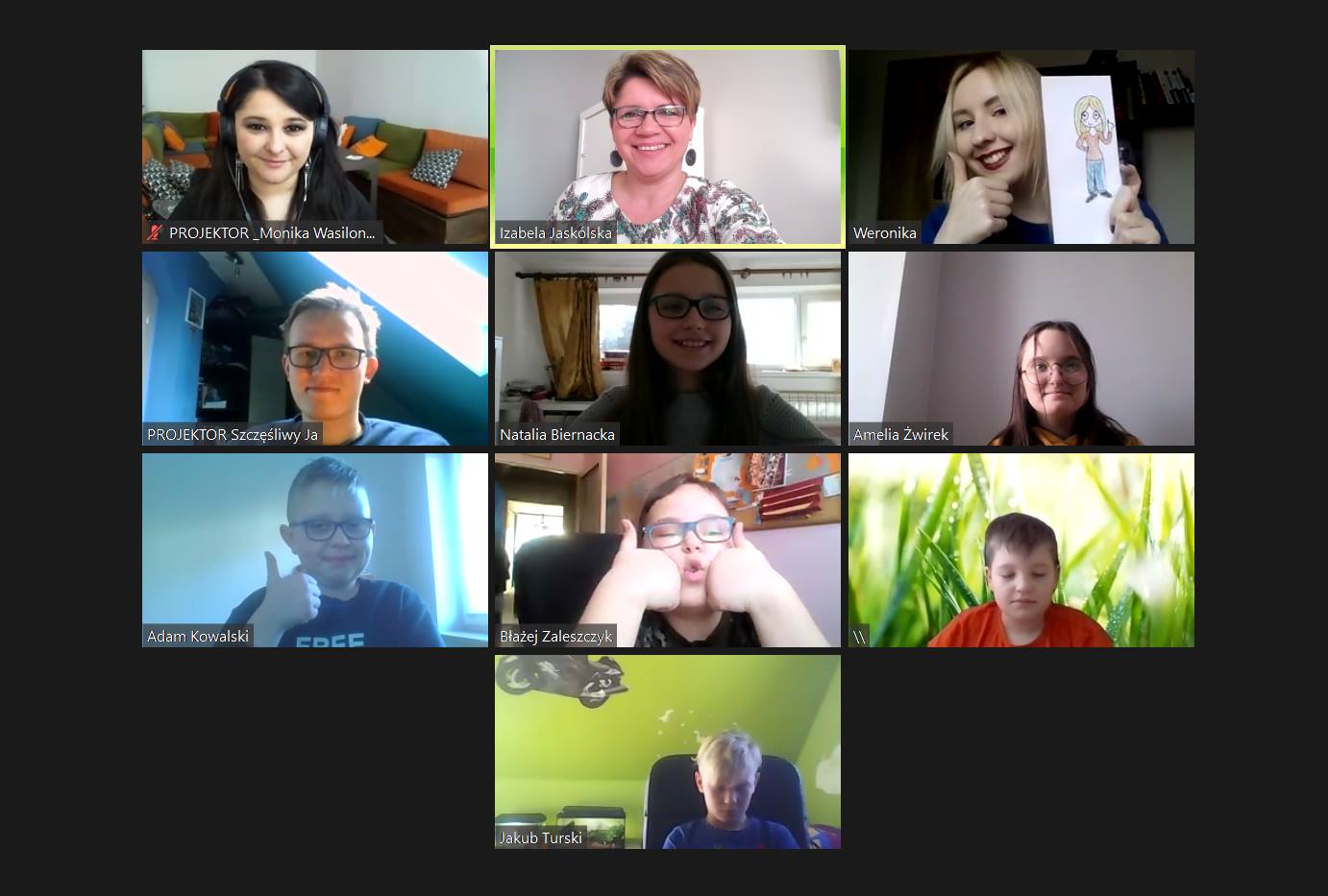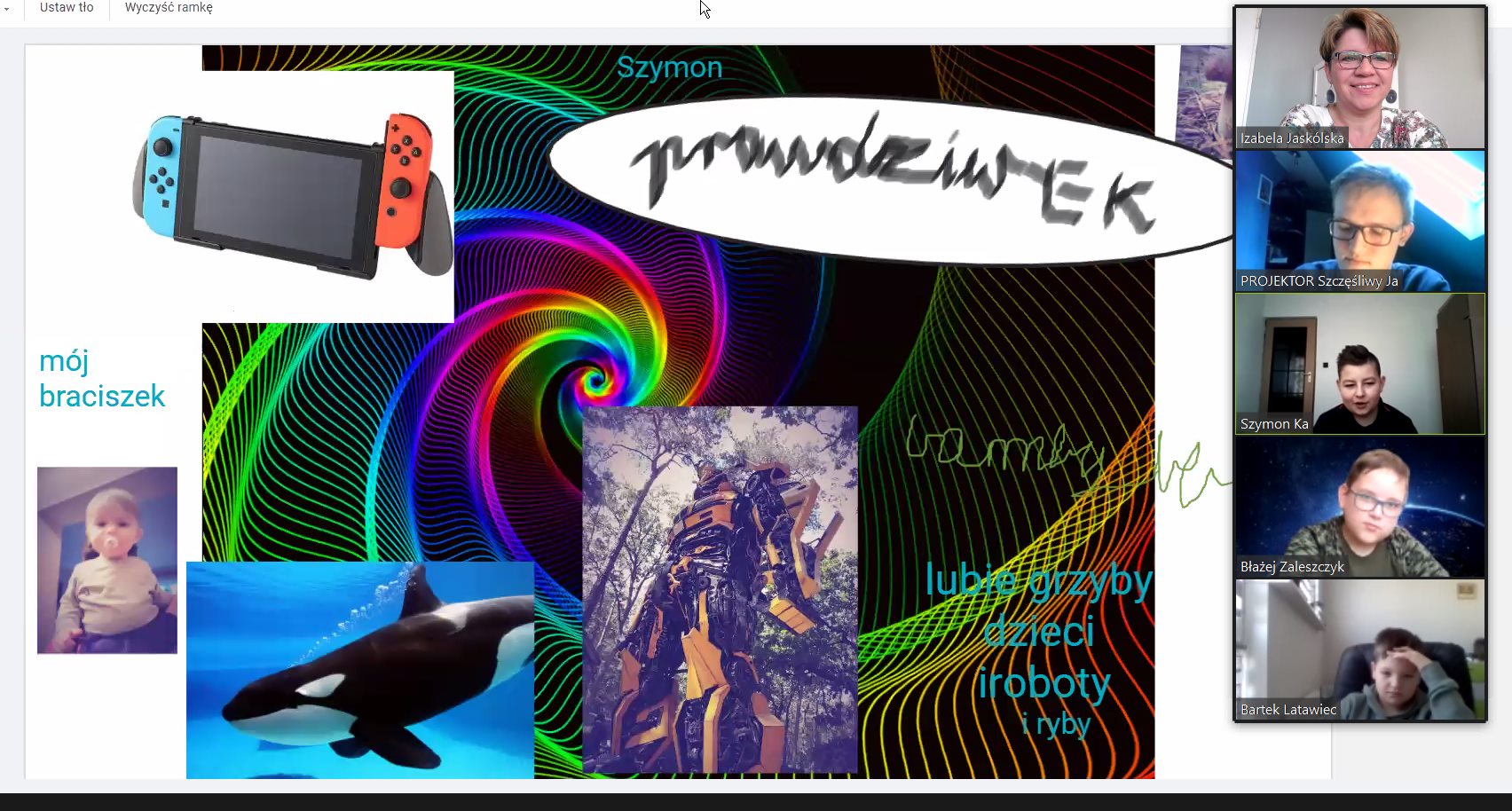 W piątek uczniowie klasy 5 wraz z wychowawczynią uczestniczyli w zajęciach pt.:„Szczęśliwy Ja – lubię siebie i innych”, prowadzonych przez studentów – wolontariuszy. Warsztaty z Wyzwaniem powstały, aby stworzyć dzieciom warunki do samodzielnego zrozumienia problemów współczesnego świata, aby pokazać dzieciom, że tematy, które są ważne w dorosłym życiu, nie muszą być trudne i nudne w nauce. Twórcy programu piszą: „Warsztaty z Wyzwaniem i Spotkania z Pasją powstały, bo wierzymy, że od dziecka mamy naturalną ciekawość świata, zdolność do uczenia się i ogromny potencjał do rozwoju. Łączymy dzieci, studentki/studentów, osoby pracujące z dziećmi (nauczycielki/nauczycieli (...) i praktyków uczenia poprzez doświadczanie”. Uczniowie mieli okazję pracować w grupach, brali aktywny udział w dyskusji i zastanawiali się nad wspólnym rozwiązaniem omawianego zagadnienia, poznali też nowe narzędzia do pracy m.in. Jamboard. Kolejne warsztaty już za tydzień!