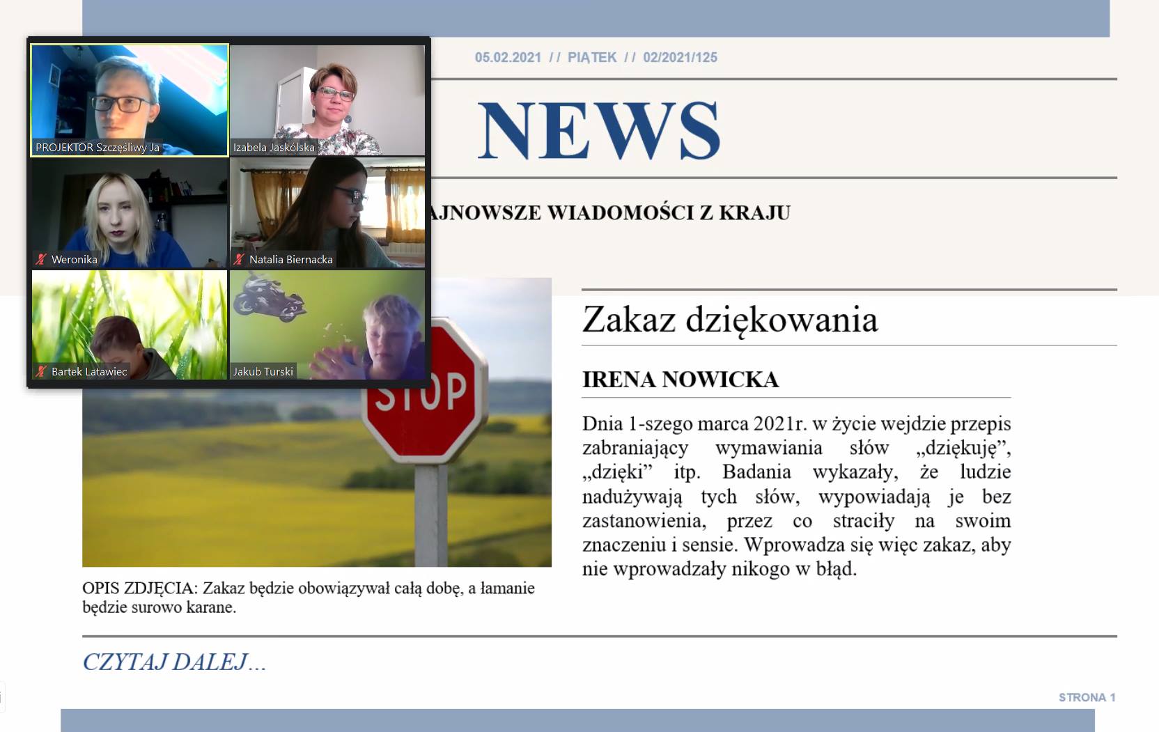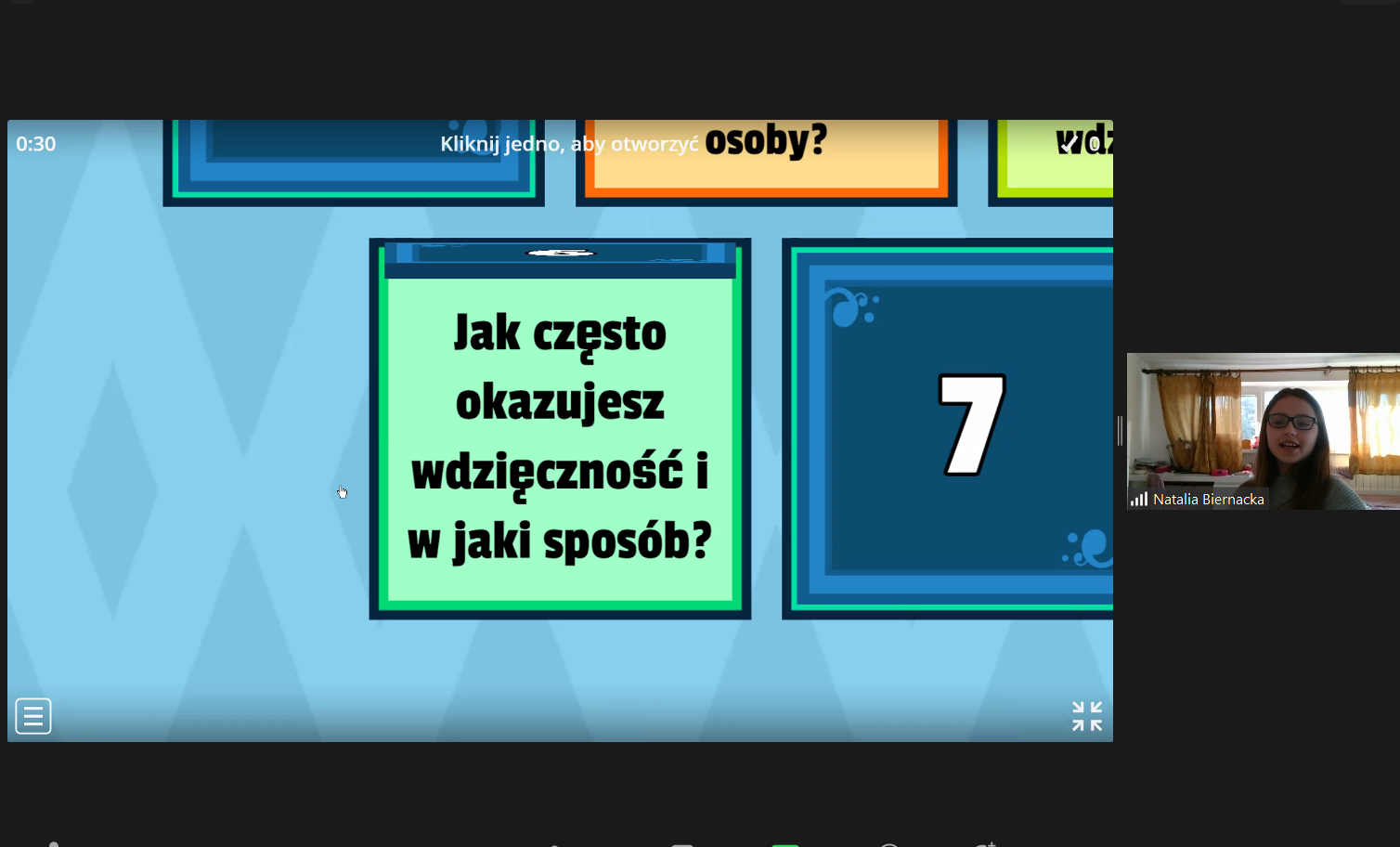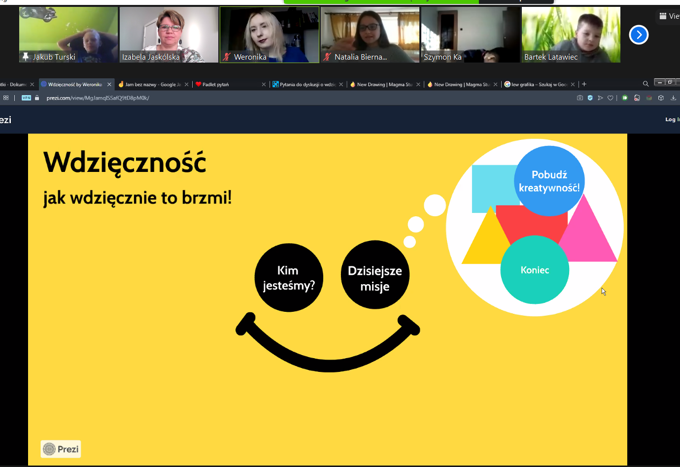 W piątek uczniowie klasy 5 wraz z wychowawczynią uczestniczyli w zajęciach pt.:„Szczęśliwy Ja – lubię siebie i innych”, prowadzonych przez studentów – wolontariuszy. Warsztaty z Wyzwaniem powstały, aby stworzyć dzieciom warunki do samodzielnego zrozumienia problemów współczesnego świata, aby pokazać dzieciom, że tematy, które są ważne w dorosłym życiu, nie muszą być trudne i nudne w nauce. Twórcy programu piszą: „Warsztaty z Wyzwaniem i Spotkania z Pasją powstały, bo wierzymy, że od dziecka mamy naturalną ciekawość świata, zdolność do uczenia się i ogromny potencjał do rozwoju. Łączymy dzieci, studentki/studentów, osoby pracujące z dziećmi (nauczycielki/nauczycieli (...) i praktyków uczenia poprzez doświadczanie”. Uczniowie mieli okazję pracować w grupach, brali aktywny udział w dyskusji i zastanawiali się nad wspólnym rozwiązaniem omawianego zagadnienia, poznali też nowe narzędzia do pracy m.in. Jamboard. Kolejne warsztaty już za tydzień!