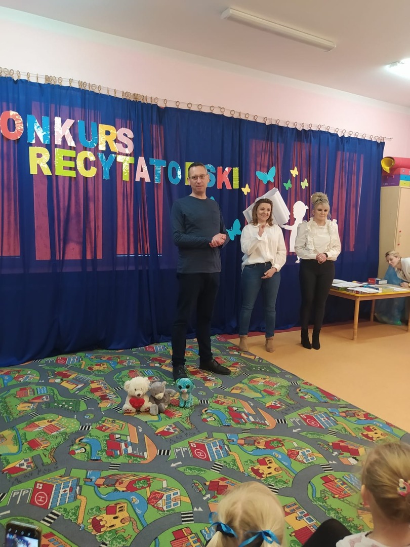 W środę 19 kwietnia odbył się w naszym przedszkolu Międzyprzedszkolny Konkurs Recytatorski "Świat wartości w poezji dziecięcej". Celem konkursu było popularyzowanie poezji dziecięcej oraz zachęcanie do występowania przed publicznością. Do konkursu przystąpiły przedszkola z terenu naszej gminy. Przedszkola: w Kaliszkach, Elemelek, Nutka, Zielona Akademia, w Kazuniu Nowym oraz Zielona Akademia z Cząstkowa. Prezentacje odbywały się pod czujnym okien Jury w składzie: Katarzyna Grabska-Gliwka, Anna Maliszewska oraz wychowawczynie z przybyłych przedszkoli. Odwiedziła Nas również, jako gość specjalny Jolanta Litwin-Sarzyńska, która po zakończeniu konkursu przeprowadziła z przedszkolakami warsztaty aktorskie. Pan Dyrektor rozpoczął konkurs od przywitania gości i przenieśliśmy się w świat poezji dziecięcej.