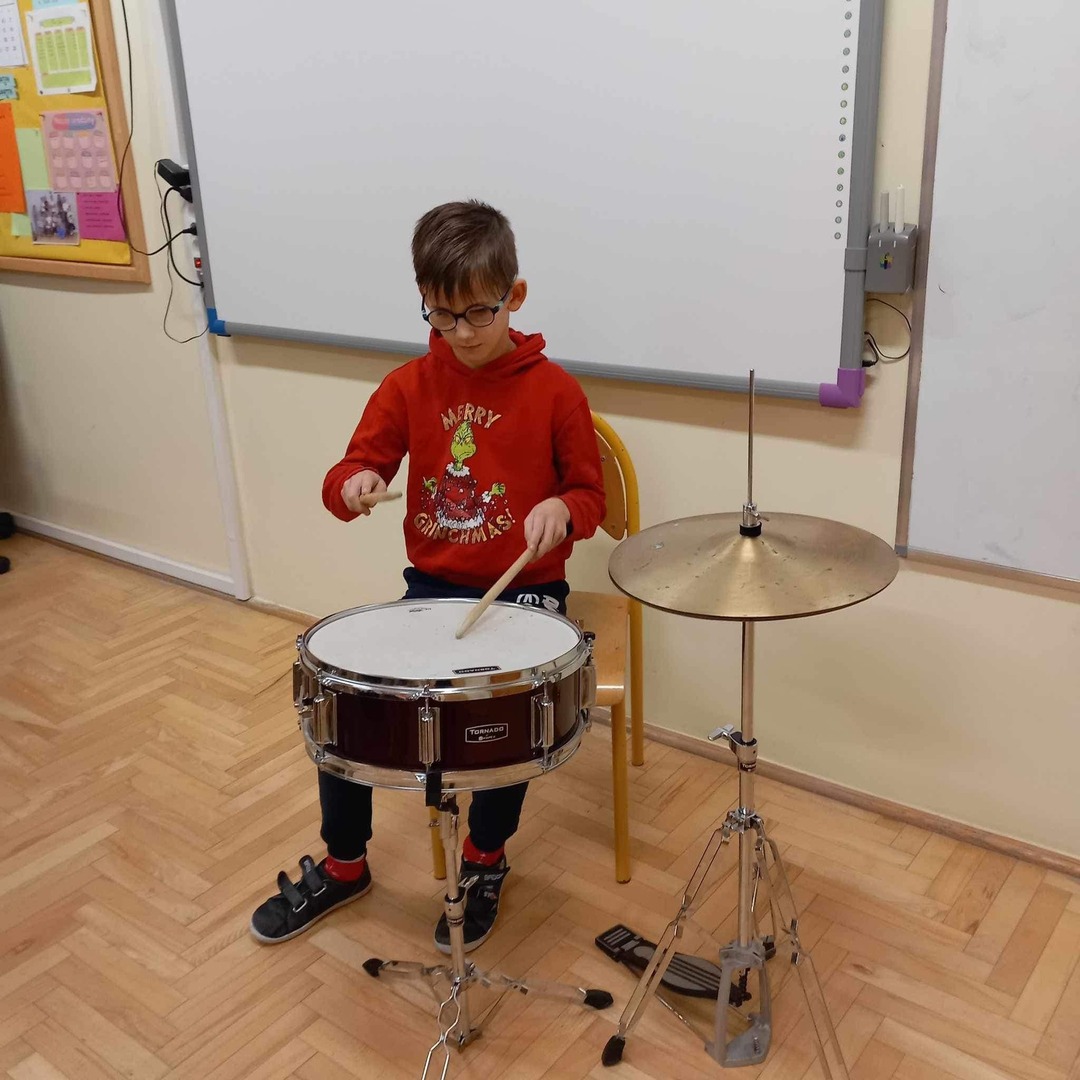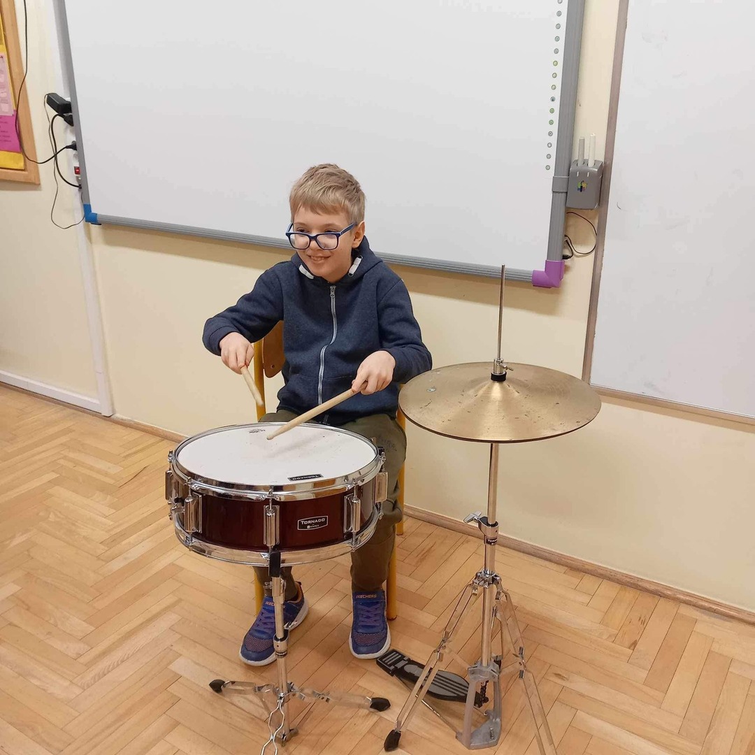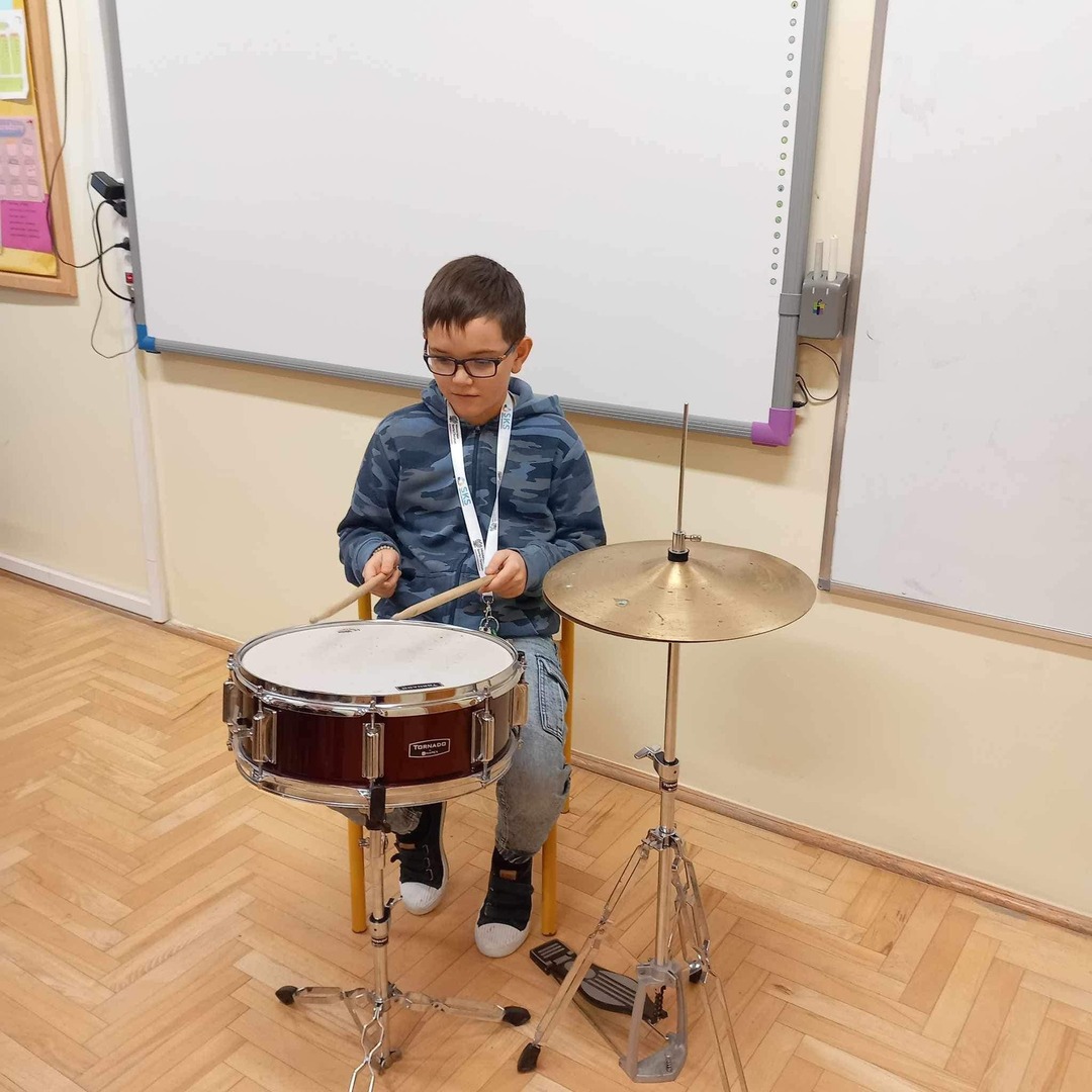 Werbel i hi-hat są to instrumenty muzyczne będące częścią zestawu perkusyjnego. Uczniowie klasy 4 świetnie się bawili poznając brzmienie oraz zastosowanie owych instrumentów.