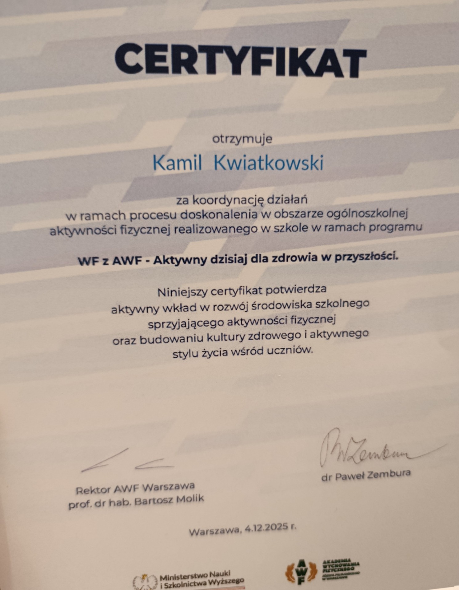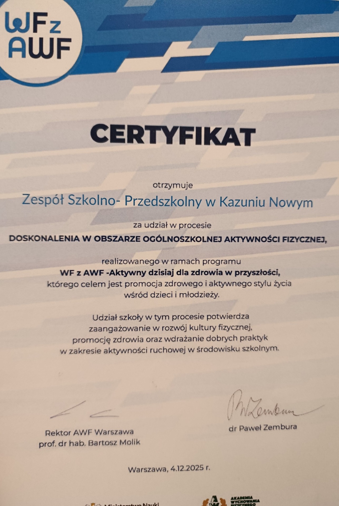 Nasza szkoła w Zakopanem otrzymała wyróżnienie za zaangażowanie w rozwój kultury fizycznej. Nasz nauczyciel wychowania fizycznego Kamil Kwiatkowski otrzymał wyróżnienie za działania w obszarze ogólnoszkolnej aktywności fizycznej. Gratulacje.